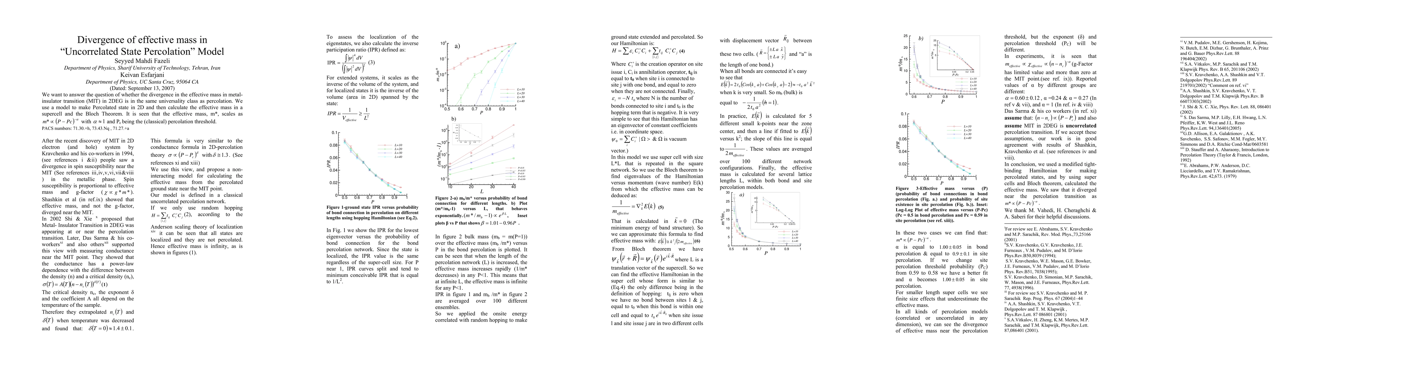 We want to answer the question of whether the divergence in the effective mass in metal-insulator transition (MIT) in 2DEG is in the same universality class as percolation. We use a model to make Percolated state in 2D and then calculate the effective mass in a super-cell and the Bloch Theorem. It is seen that the effective mass, m*, scales as m*~(P-Pc)^a with a=1 and Pc being the (classical) percolation threshold.