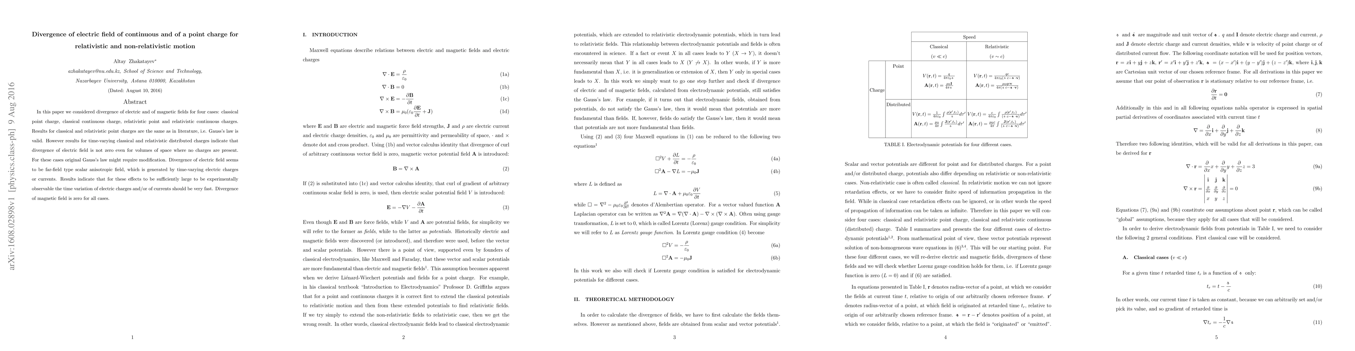 This paper investigates the divergence of electric and magnetic fields for classical and relativistic point and continuous charges. It finds that while Gauss's law holds for point charges, time-varying distributed charges lead to non-zero divergence in electric fields, suggesting a need for modifications to the original law. The divergence is identified as a scalar anisotropic field generated by fast time-varying electric charges or currents.