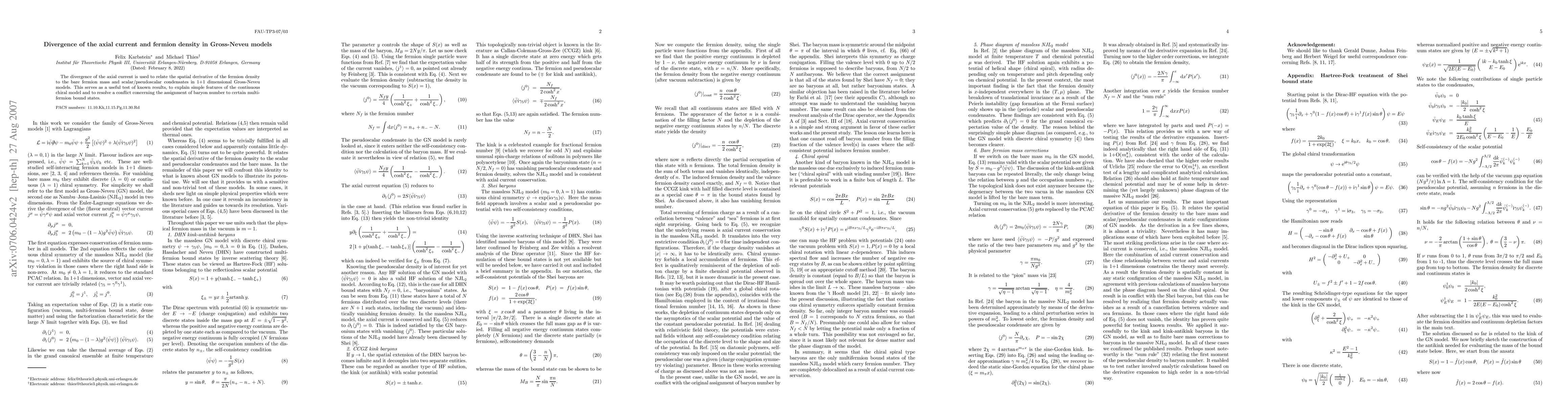 The divergence of the axial current is used to relate the spatial derivative of the fermion density to the bare fermion mass and scalar/pseudoscalar condensates in 1+1 dimensional Gross-Neveu models. This serves as a novel test of known results, to explain simple features of the continuous chiral model and to resolve a conflict concerning the assignment of baryon number to certain multi-fermion bound states.