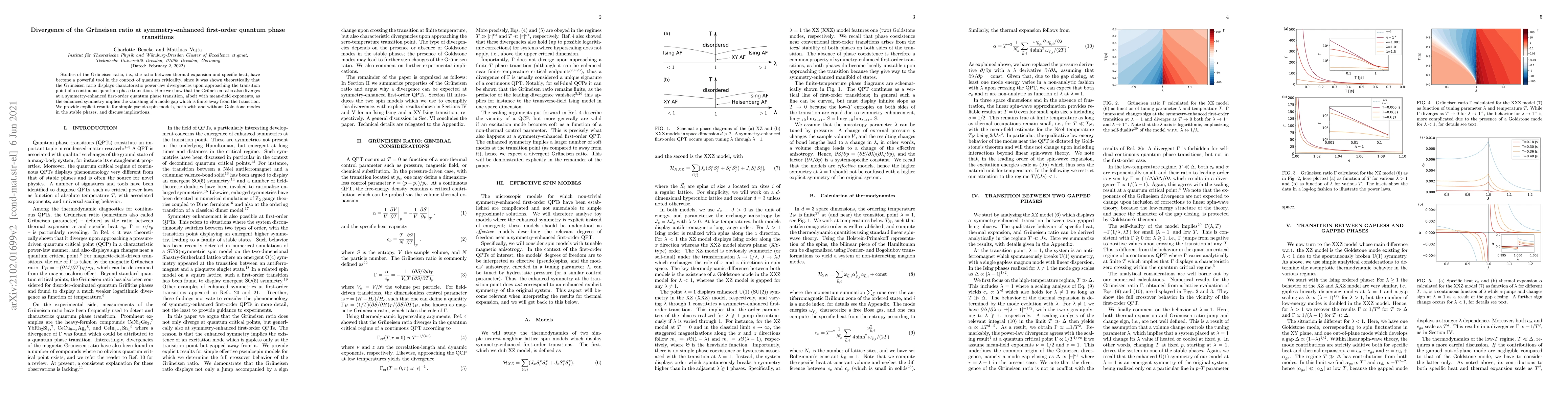 This study demonstrates that the Grüneisen ratio diverges at symmetry-enhanced first-order quantum phase transitions, contrary to continuous quantum phase transitions. The divergence follows mean-field exponents due to enhanced symmetry and the absence of a mode gap near the transition point.