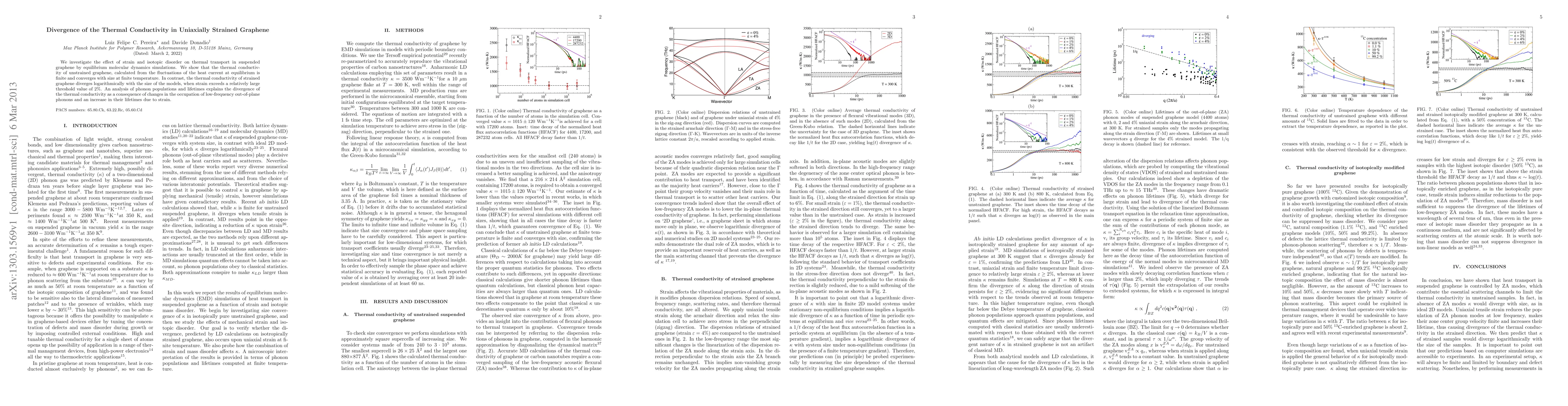 We investigate the effect of strain and isotopic disorder on thermal transport in suspended graphene by equilibrium molecular dynamics simulations. We show that the thermal conductivity of unstrained graphene, calculated from the fluctuations of the heat current at equilibrium is finite and converges with size at finite temperature. In contrast, the thermal conductivity of strained graphene diverges logarithmically with the size of the models, when strain exceeds a relatively large threshold value of 2%. An analysis of phonon populations and lifetimes explains the divergence of the thermal conductivity as a consequence of changes in the occupation of low-frequency out-of-plane phonons and an increase in their lifetimes due to strain.