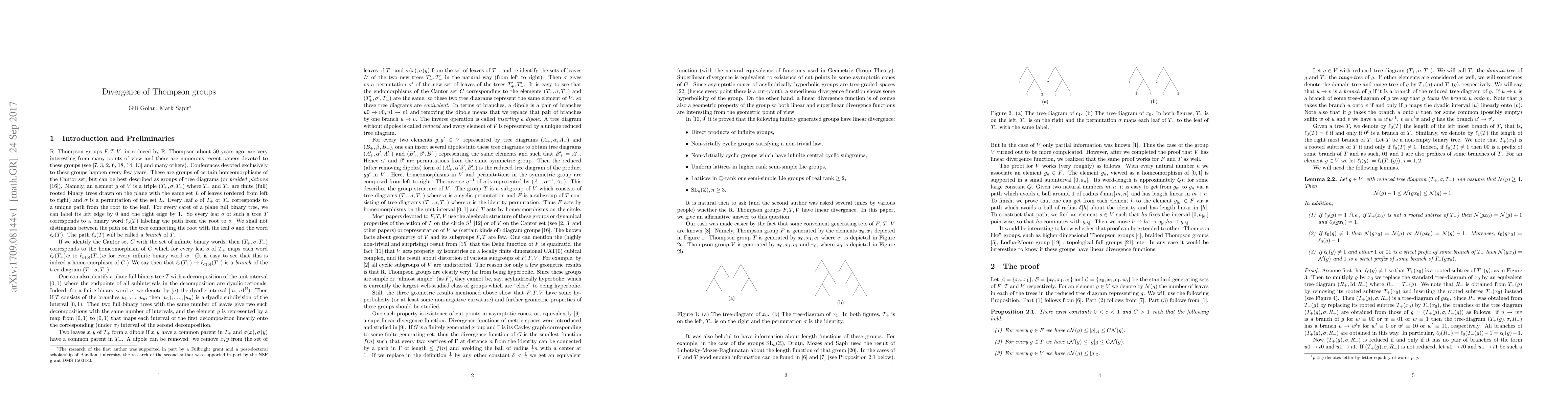 Summary: The paper demonstrates that the divergence functions for R. Thompson groups F, T, V exhibit linear divergence, providing a significant insight into their structural properties. This result contributes to the understanding of the algebraic and geometric characteristics of these groups.