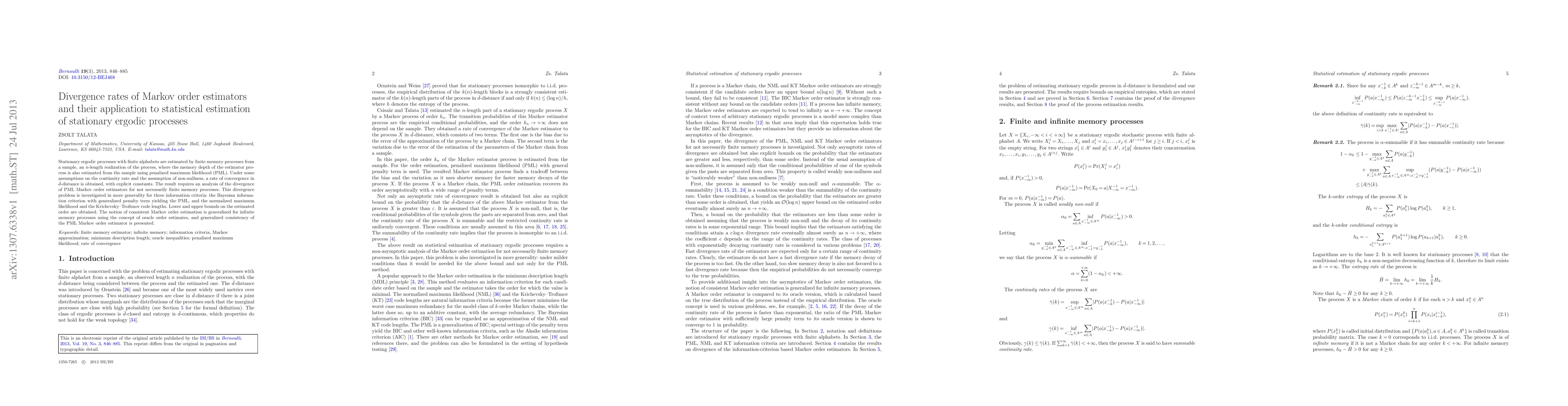 Stationary ergodic processes with finite alphabets are estimated by finite memory processes from a sample, an n-length realization of the process, where the memory depth of the estimator process is also estimated from the sample using penalized maximum likelihood (PML). Under some assumptions on the continuity rate and the assumption of non-nullness, a rate of convergence in $\bar{d}$-distance is obtained, with explicit constants. The result requires an analysis of the divergence of PML Markov order estimators for not necessarily finite memory processes. This divergence problem is investigated in more generality for three information criteria: the Bayesian information criterion with generalized penalty term yielding the PML, and the normalized maximum likelihood and the Krichevsky-Trofimov code lengths. Lower and upper bounds on the estimated order are obtained. The notion of consistent Markov order estimation is generalized for infinite memory processes using the concept of oracle order estimates, and generalized consistency of the PML Markov order estimator is presented.