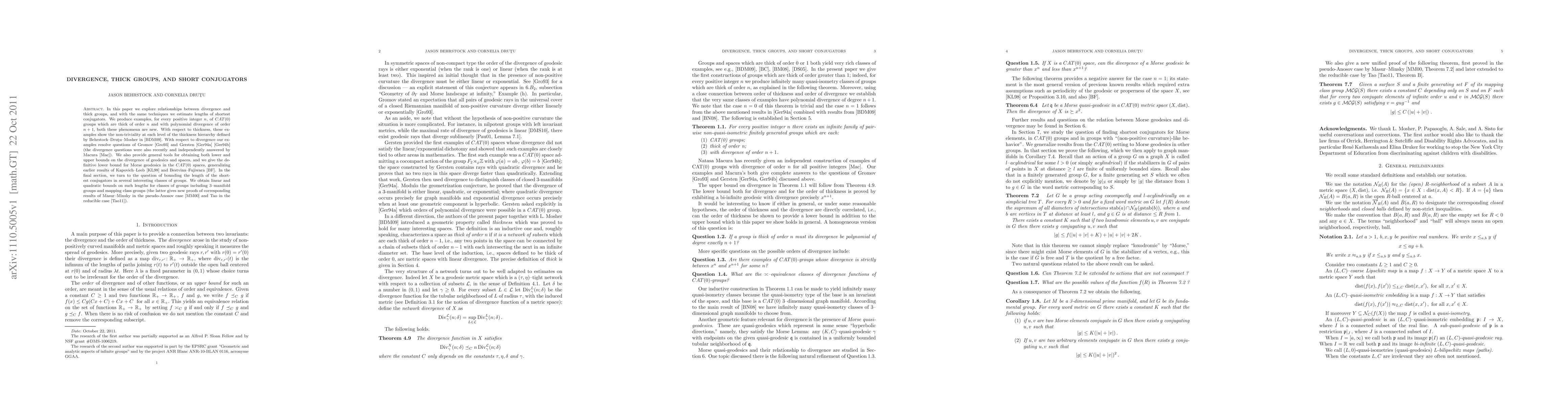 In this paper we explore relationships between divergence and thick groups, and with the same techniques we estimate lengths of shortest conjugators. We produce examples, for every positive integer n, of CAT(0) groups which are thick of order n and with polynomial divergence of order n+1, both these phenomena are new. With respect to thickness, these examples show the non-triviality at each level of the thickness hierarchy defined by Behrstock-Drutu-Mosher. With respect to divergence our examples resolve questions of Gromov and Gersten (the divergence questions were also recently and independently answered by Macura. We also provide general tools for obtaining both lower and upper bounds on the divergence of geodesics and spaces, and we give the definitive lower bound for Morse geodesics in the CAT(0) spaces, generalizing earlier results of Kapovich-Leeb and Bestvina-Fujiwara. In the final section, we turn to the question of bounding the length of the shortest conjugators in several interesting classes of groups. We obtain linear and quadratic bounds on such lengths for classes of groups including 3-manifold groups and mapping class groups (the latter gives new proofs of corresponding results of Masur-Minsky in the pseudo-Anosov case and Tao in the reducible case).