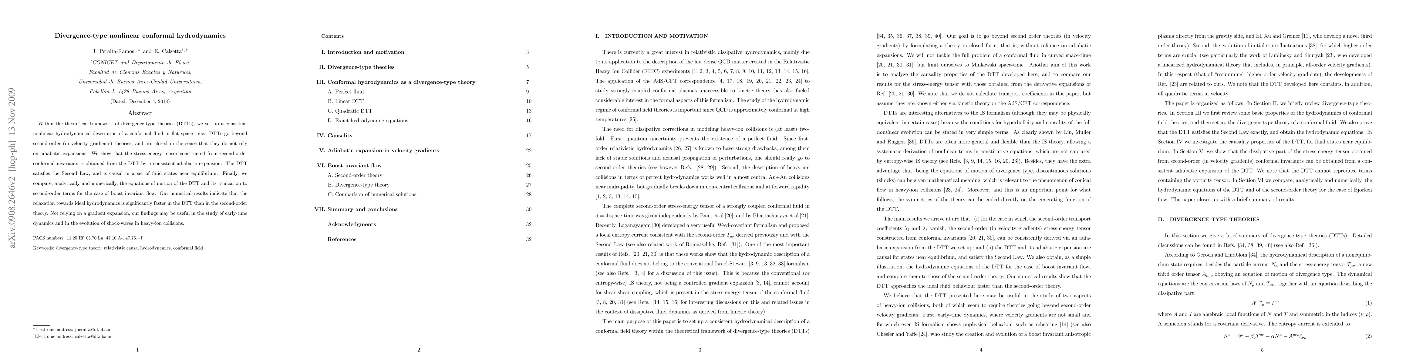 Within the theoretical framework of divergence-type theories (DTTs), we set up a consistent nonlinear hydrodynamical description of a conformal fluid in flat space-time. DTTs go beyond second-order (in velocity gradients) theories, and are closed in the sense that they do not rely on adiabatic expansions. We show that the stress-energy tensor constructed from second-order conformal invariants is obtained from the DTT by a consistent adiabatic expansion. The DTT satisfies the Second Law, and is causal in a set of fluid states near equilibrium. Finally, we compare, analytically and numerically, the equations of motion of the DTT and its truncation to second-order terms for the case of boost invariant flow. Our numerical results indicate that the relaxation towards ideal hydrodynamics is significantly faster in the DTT than in the second-order theory. Not relying on a gradient expansion, our findings may be useful in the study of early-time dynamics and in the evolution of shock-waves in heavy-ion collisions.