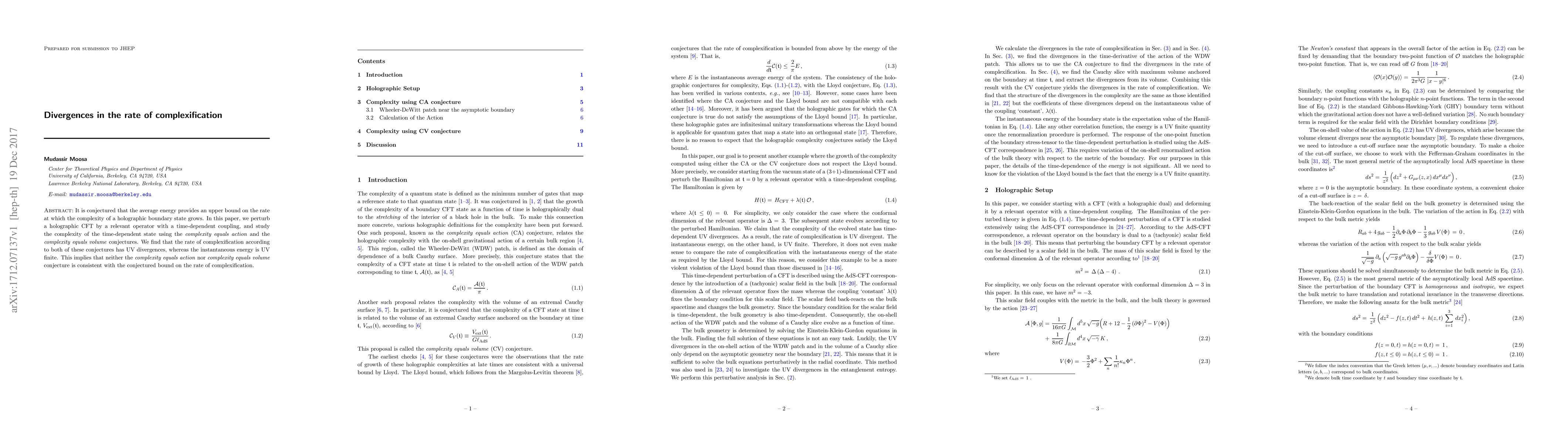 It is conjectured that the average energy provides an upper bound on the rate at which the complexity of a holographic boundary state grows. In this paper, we perturb a holographic CFT by a relevant operator with a time-dependent coupling, and study the complexity of the time-dependent state using the \textit{complexity equals action} and the \textit{complexity equals volume} conjectures. We find that the rate of complexification according to both of these conjectures has UV divergences, whereas the instantaneous energy is UV finite. This implies that neither the \textit{complexity equals action} nor \textit{complexity equals volume} conjecture is consistent with the conjectured bound on the rate of complexification.