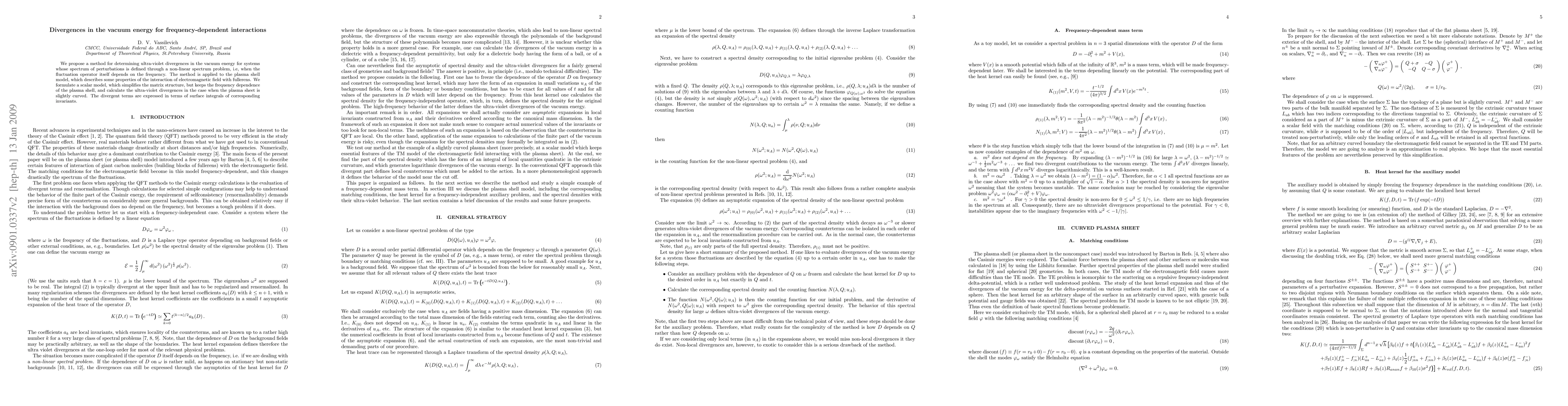 We propose a method for determining ultra-violet divergences in the vacuum energy for systems whose spectrum of perturbations is defined through a non-linear spectrum problem, i.e, when the fluctuation operator itself depends on the frequency. The method is applied to the plasma shell model, which describes some properties of the interaction of electromagnetic field with fullerens. We formulate a scalar model, which simplifies the matrix structure, but keeps the frequency dependence of the plasma shell, and calculate the ultra-violet divergences in the case when the plasma sheet is slightly curved. The divergent terms are expressed in terms of surface integrals of corresponding invariants.