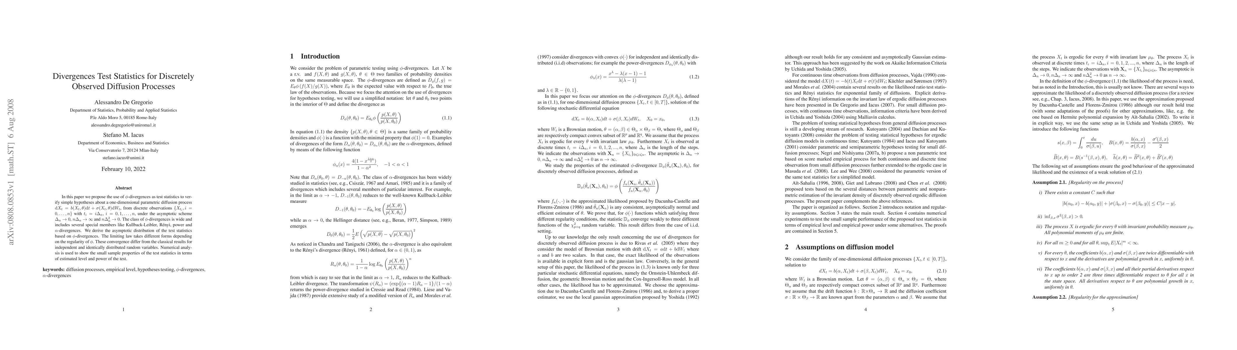 This paper introduces using phi-divergences as test statistics to verify hypotheses about a parametric diffusion process from discrete observations, with implications for asymptotic distributions and small sample properties.