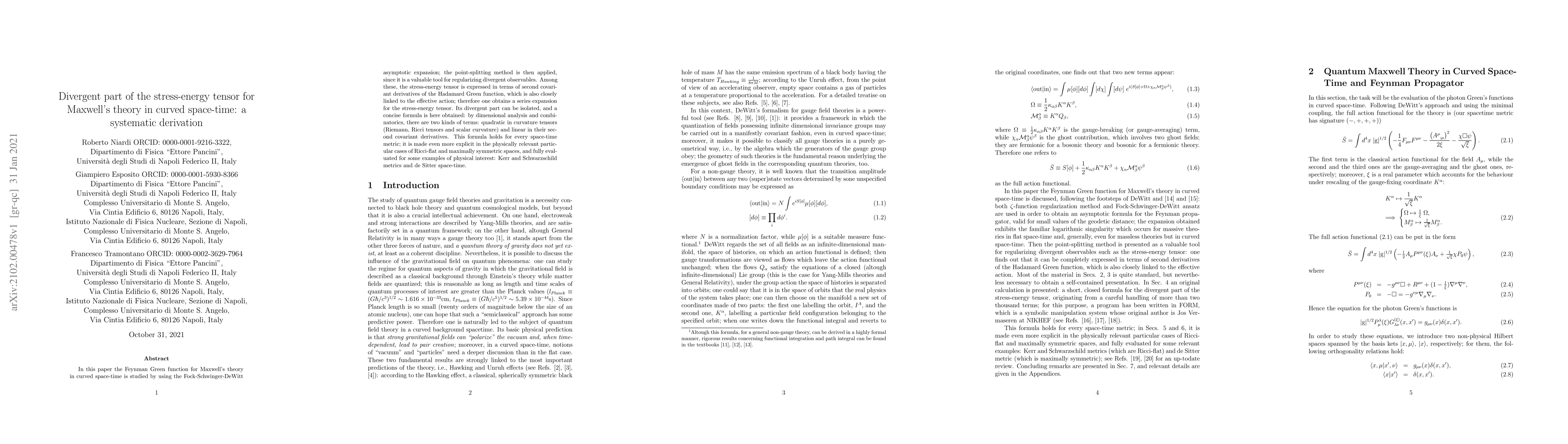 In this paper the Feynman Green function for Maxwell's theory in curved space-time is studied by using the Fock-Schwinger-DeWitt asymptotic expansion; the point-splitting method is then applied, since it is a valuable tool for regularizing divergent observables. Among these, the stress-energy tensor is expressed in terms of second covariant derivatives of the Hadamard Green function, which is also closely linked to the effective action; therefore one obtains a series expansion for the stress-energy tensor. Its divergent part can be isolated, and a concise formula is here obtained: by dimensional analysis and combinatorics, there are two kinds of terms: quadratic in curvature tensors (Riemann, Ricci tensors and scalar curvature) and linear in their second covariant derivatives. This formula holds for every space-time metric; it is made even more explicit in the physically relevant particular cases of Ricci-flat and maximally symmetric spaces, and fully evaluated for some examples of physical interest: Kerr and Schwarzschild metrics and de Sitter space-time.