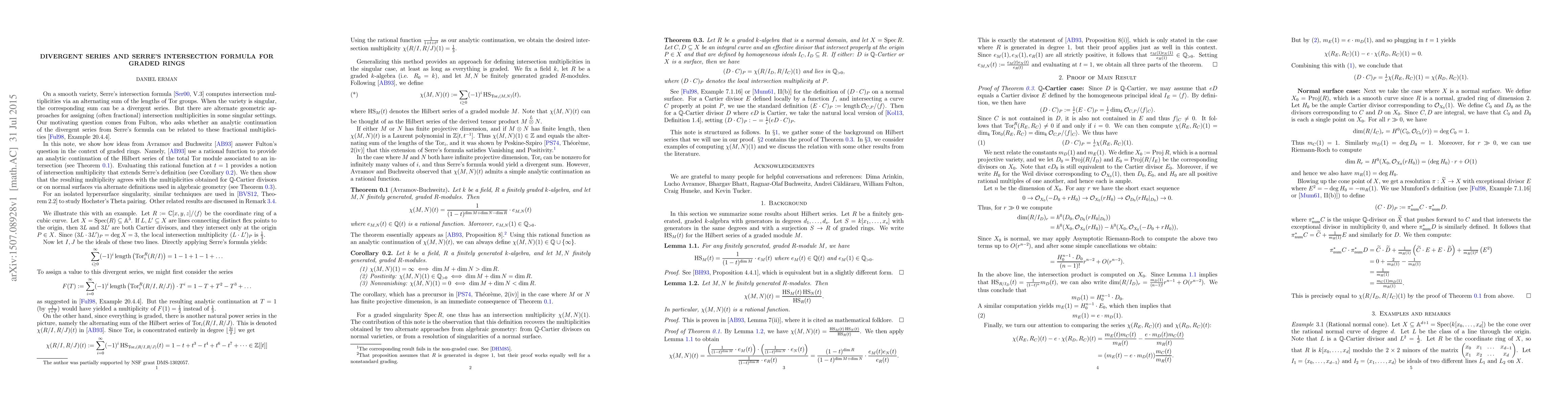 On a smooth variety, Serre's intersection formula computes intersection multiplicities via an alternating sum of the lengths of Tor groups. When the variety is singular, the corresponding sum can be a divergent series. But there are alternate geometric approaches for assigning (often fractional) intersection multiplicities in some singular settings. Our motivating question comes from Fulton, who asks whether an analytic continuation of the divergent series from Serre's formula can be related to these fractional multiplicities. By applying work of Avramov and Buchweitz, we positively answer Fulton's question in the context of graded rings.