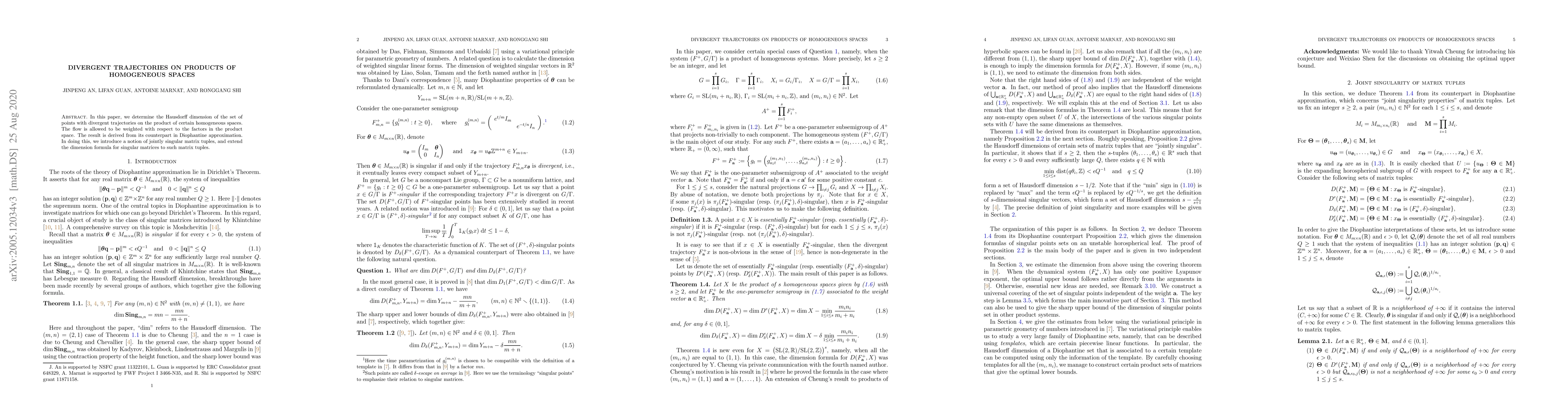 In this paper, we determine the Hausdorff dimension of the set of points with divergent trajectories on the product of certain homogeneous spaces. The flow is allowed to be weighted with respect to the factors in the product space. The result is derived from its counterpart in Diophantine approximation. In doing this, we introduce a notion of jointly singular matrix tuples, and extend the dimension formula for singular matrices to such matrix tuples.