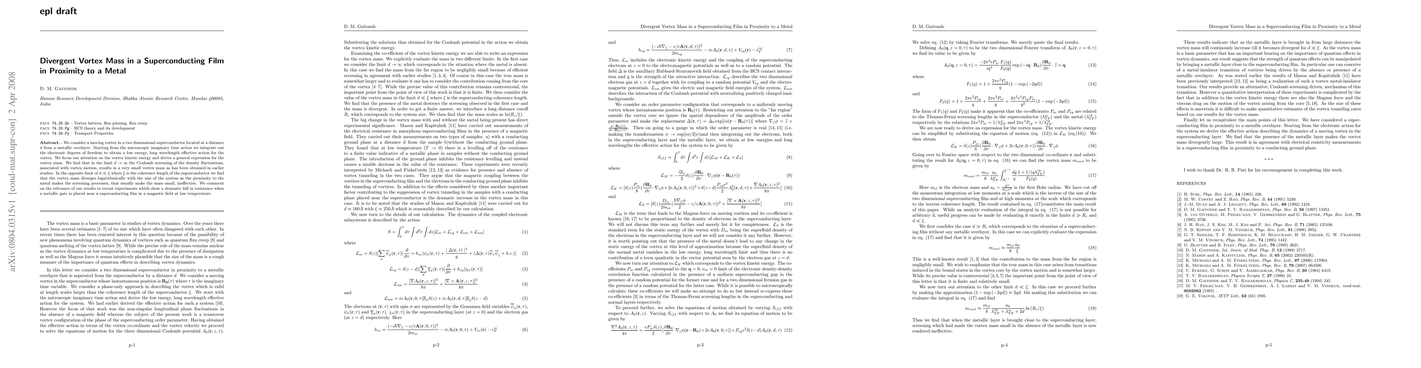 We consider a moving vortex in a two dimensional superconductor located at a distance $d$ from a metallic overlayer. Starting from the microscopic imaginary time action we integrate out the electronic degrees of freedom to obtain a low energy, long wavelength effective action for the vortex. We focus our attention on the vortex kinetic energy and derive a general expression for the vortex mass. We find that in the limit $d\to \infty$ the Coulomb screening of the density fluctuations, associated with vortex motion, results in a very small vortex mass as has been obtained in earlier studies. In the opposite limit of $d\ll \xi $ where $\xi$ is the coherence length of the superconductor we find that the vortex mass diverges logarithmically with the size of the system as the proximity to the metal makes the screening processes, that usually make the mass small, ineffective. We comment on the relevance of our results to recent experiments which show a dramatic fall in resistance when a metallic gate is placed near a supeconducting film in a magnetic field at low temperature.