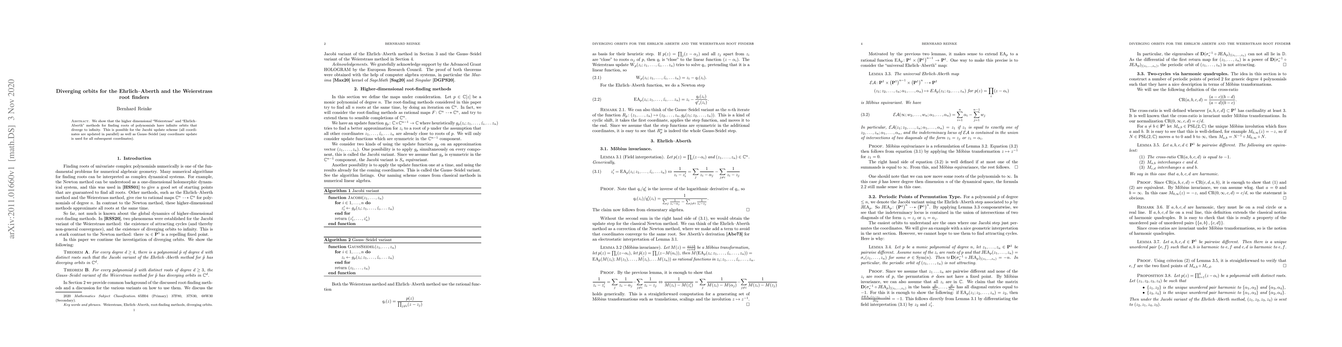 Summary: The research demonstrates that both the Weierstrass and Ehrlich-Aberth methods for polynomial root-finding exhibit infinite diverging orbits under both Jacobi and Gauss-Seidel update schemes, indicating instability in these higher-dimensional root-finding approaches.
