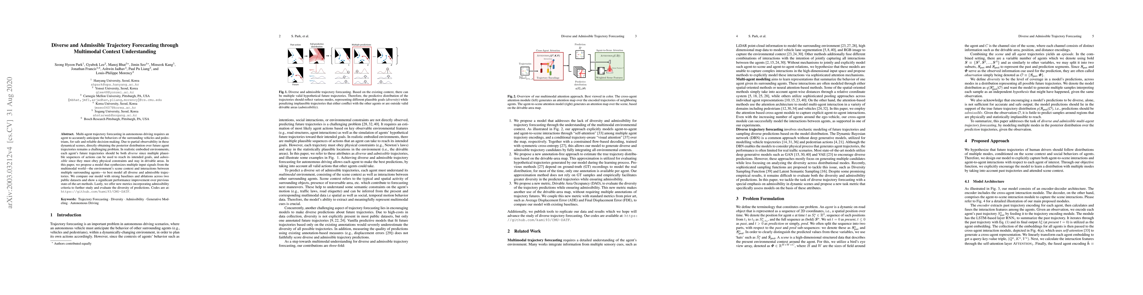 Multi-agent trajectory forecasting in autonomous driving requires an agent to accurately anticipate the behaviors of the surrounding vehicles and pedestrians, for safe and reliable decision-making. Due to partial observability in these dynamical scenes, directly obtaining the posterior distribution over future agent trajectories remains a challenging problem. In realistic embodied environments, each agent's future trajectories should be both diverse since multiple plausible sequences of actions can be used to reach its intended goals, and admissible since they must obey physical constraints and stay in drivable areas. In this paper, we propose a model that synthesizes multiple input signals from the multimodal world|the environment's scene context and interactions between multiple surrounding agents|to best model all diverse and admissible trajectories. We compare our model with strong baselines and ablations across two public datasets and show a significant performance improvement over previous state-of-the-art methods. Lastly, we offer new metrics incorporating admissibility criteria to further study and evaluate the diversity of predictions. Codes are at: https://github.com/kami93/CMU-DATF.
