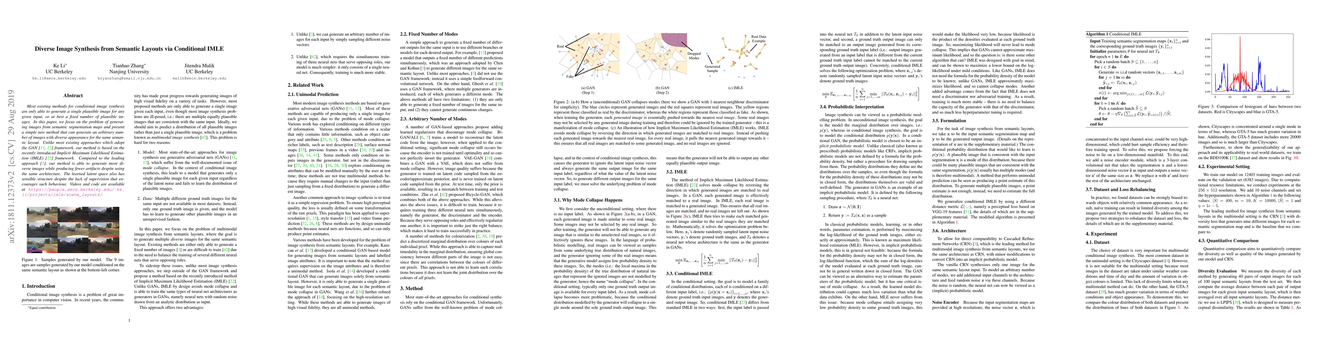 Most existing methods for conditional image synthesis are only able to generate a single plausible image for any given input, or at best a fixed number of plausible images. In this paper, we focus on the problem of generating images from semantic segmentation maps and present a simple new method that can generate an arbitrary number of images with diverse appearance for the same semantic layout. Unlike most existing approaches which adopt the GAN framework, our method is based on the recently introduced Implicit Maximum Likelihood Estimation (IMLE) framework. Compared to the leading approach, our method is able to generate more diverse images while producing fewer artifacts despite using the same architecture. The learned latent space also has sensible structure despite the lack of supervision that encourages such behaviour. Videos and code are available at https://people.eecs.berkeley.edu/~ke.li/projects/imle/scene_layouts/.