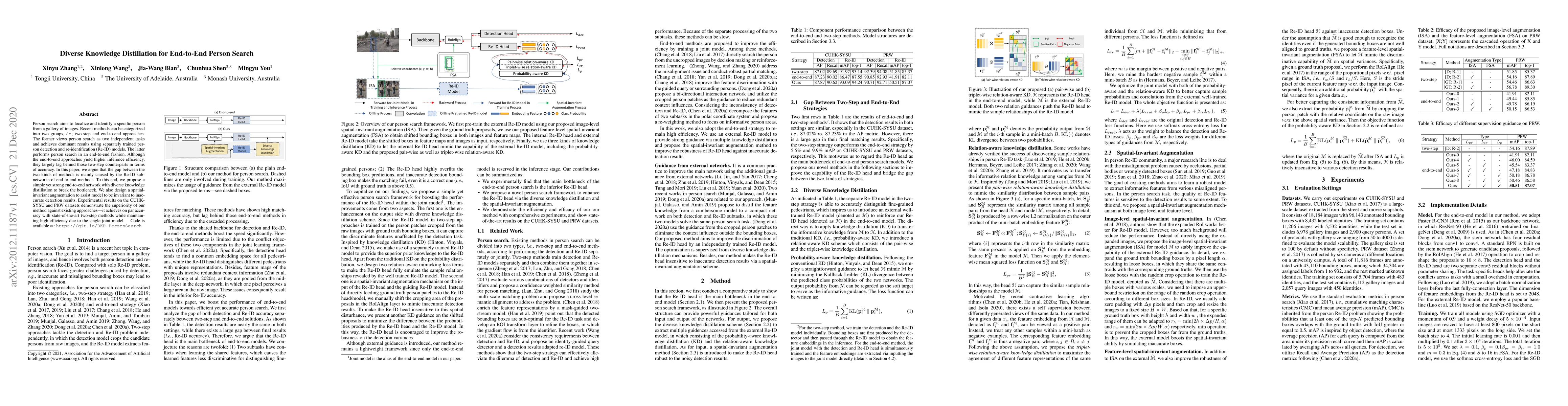 This paper proposes a novel end-to-end network for person search using diverse knowledge distillation to improve the accuracy of Re-ID sub-networks, achieving competitive results against state-of-the-art two-step methods while maintaining high inference efficiency. Experimental validation on CUHK-SYSU and PRW datasets confirms the effectiveness of the proposed method.