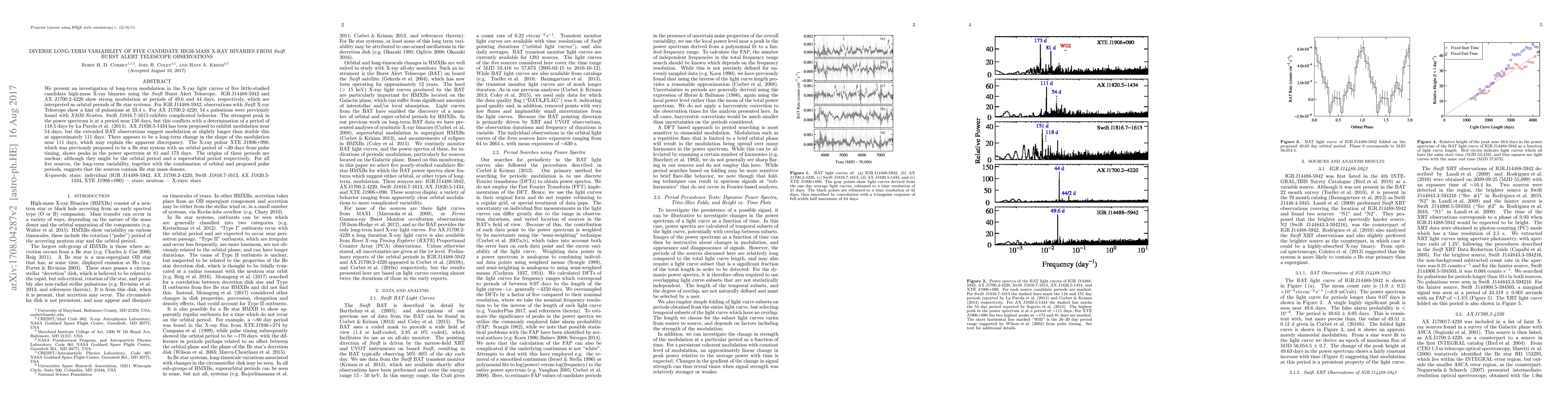 We present an investigation of long-term modulation in the X-ray light curves of five little-studied candidate high-mass X-ray binaries using the Swift Burst Alert Telescope. IGR J14488-5942 and AX J1700.2-4220 show strong modulation at periods of 49.6 and 44 days, respectively, which are interpreted as orbital periods of Be star systems. For IGR J14488-5942, observations with Swift X-ray Telescope show a hint of pulsations at 33.4 s. For AX J1700.2-4220, 54 s pulsations were previously found with XMM. Swift J1816.7-1613 exhibits complicated behavior. The strongest peak in the power spectrum is at a period near 150 days, but this conflicts with a determination of a period of 118.5 days by La Parola et al. (2014). AX J1820.5-1434 has been proposed to exhibit modulation near 54 days, but the extended BAT observations suggest modulation at slightly longer than double this at approximately 111 days. There appears to be a long-term change in the shape of the modulation near 111 days, which may explain the apparent discrepancy. The X-ray pulsar XTE J1906+090, which was previously proposed to be a Be star system with an orbital period of ~30 days from pulse timing, shows peaks in the power spectrum at 81 and 173 days. The origins of these periods are unclear, although they might be the orbital period and a superorbital period respectively. For all five sources, the long-term variability, together with the combination of orbital and proposed pulse periods, suggests that the sources contain Be star mass donors.