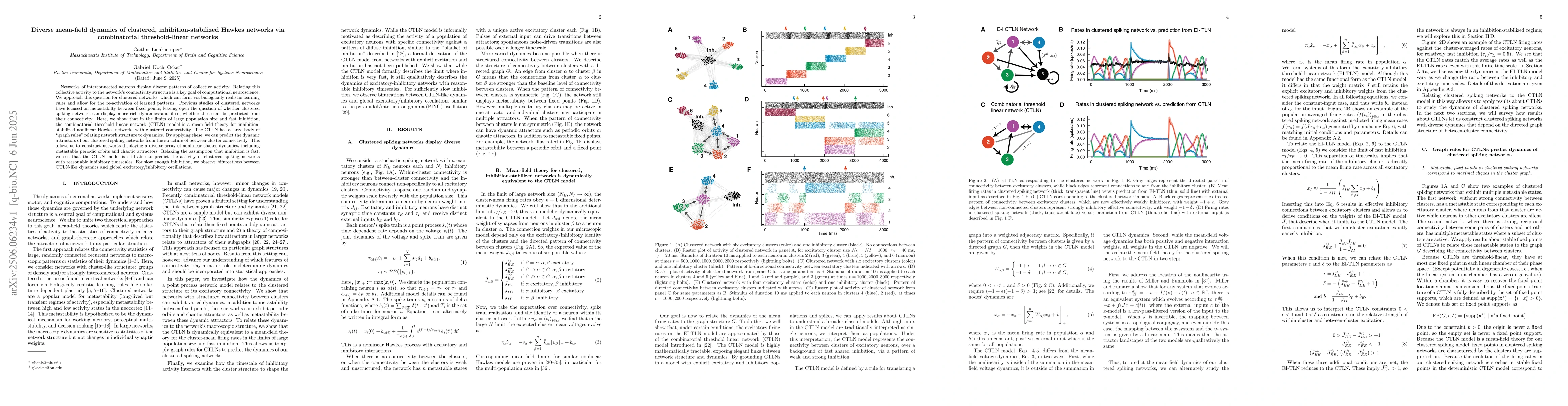 Networks of interconnected neurons display diverse patterns of collective activity. Relating this collective activity to the network's connectivity structure is a key goal of computational neuroscience. We approach this question for clustered networks, which can form via biologically realistic learning rules and allow for the re-activation of learned patterns. Previous studies of clustered networks have focused on metastabilty between fixed points, leaving open the question of whether clustered spiking networks can display more rich dynamics--and if so, whether these can be predicted from their connectivity. Here, we show that in the limits of large population size and fast inhibition, the combinatorial threshold linear network (CTLN) model is a mean-field theory for inhibition-stabilized nonlinear Hawkes networks with clustered connectivity. The CTLN has a large body of ``graph rules'' relating network structure to dynamics. By applying these, we can predict the dynamic attractors of our clustered spiking networks from the structure of between-cluster connectivity. This allows us to construct networks displaying a diverse array of nonlinear cluster dynamics, including metastable periodic orbits and chaotic attractors. Relaxing the assumption that inhibition is fast, we see that the CTLN model is still able to predict the activity of clustered spiking networks with reasonable inhibitory timescales. For slow enough inhibition, we observe bifurcations between CTLN-like dynamics and global excitatory/inhibitory oscillations.