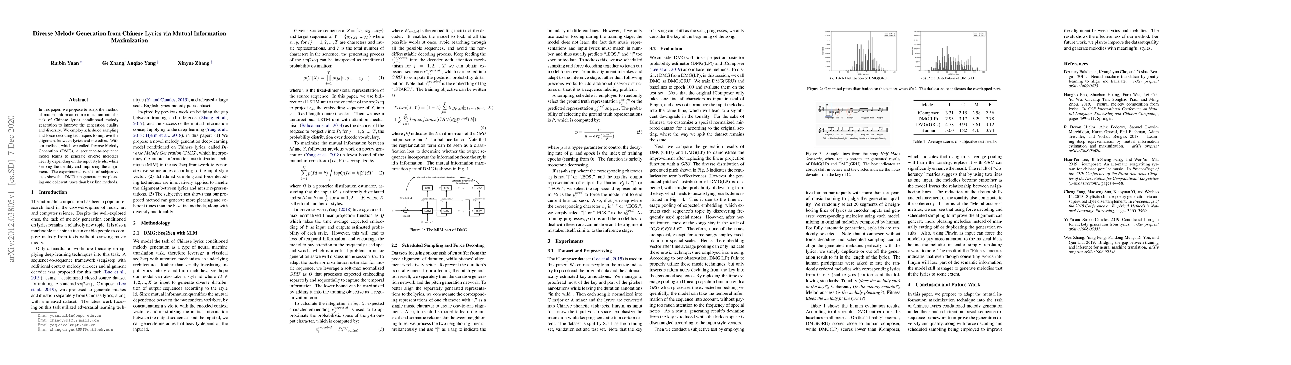 A new method called Diverse Melody Generation (DMG) improves melody generation from Chinese lyrics by leveraging mutual information maximization and incorporating scheduled sampling and force decoding techniques to enhance alignment and diversity. The results show that DMG can generate more pleasing and coherent tunes than baseline methods.
