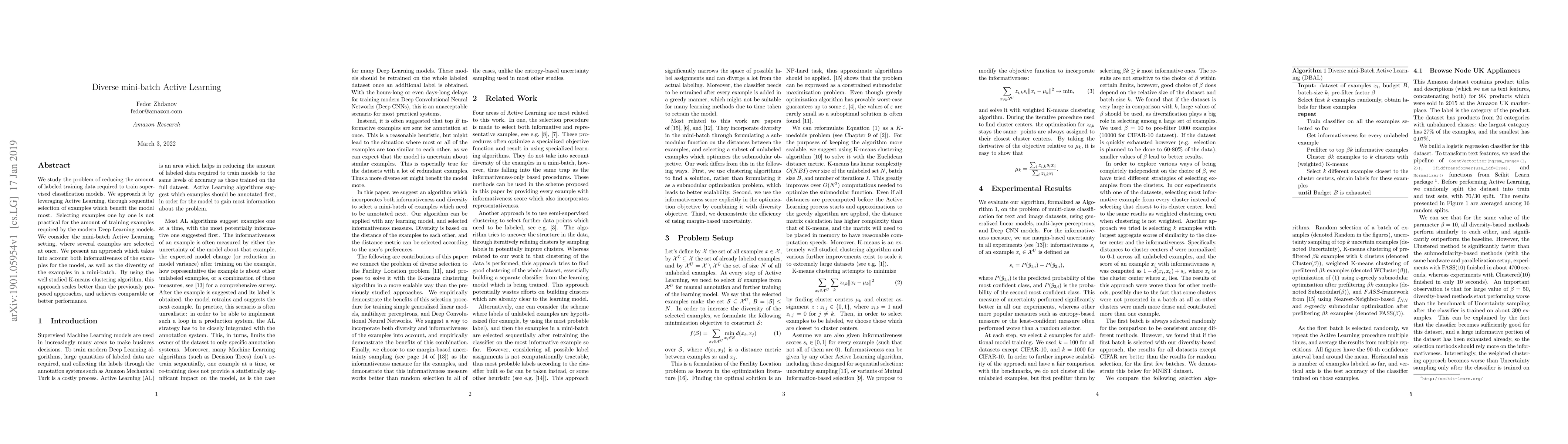 This paper proposes a mini-batch Active Learning method that selects multiple informative and diverse examples simultaneously to reduce labeled data requirements for training deep learning models. It utilizes K-means clustering for scalability and achieves comparable or superior performance compared to previous techniques.