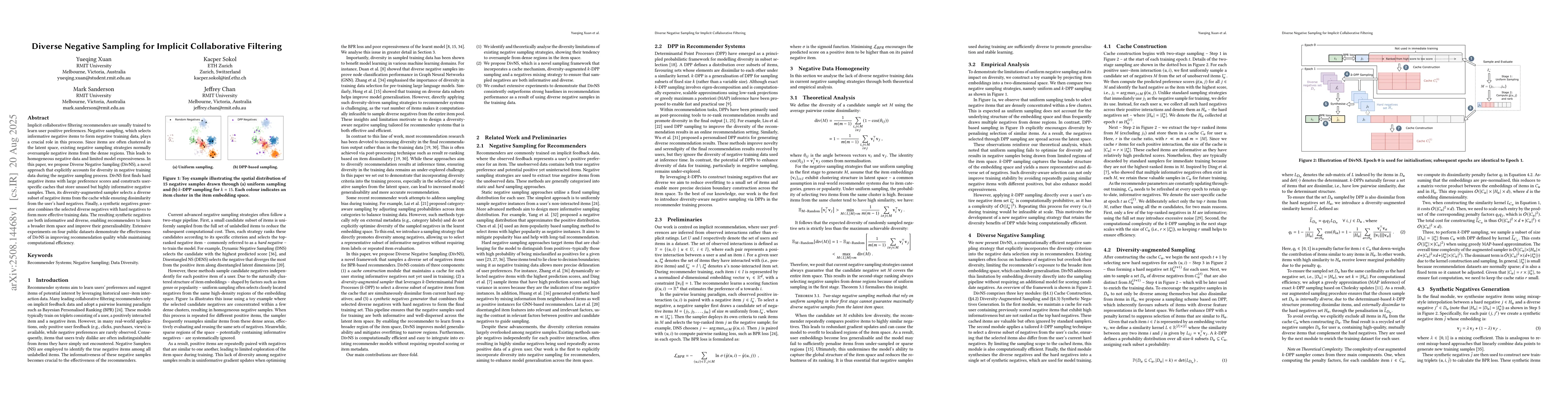 DivNS introduces a novel framework for negative sampling in collaborative filtering that constructs user-specific caches, applies diversity-augmented sampling via k-DPP, and synthesizes negative items using mixup-style interpolation.
