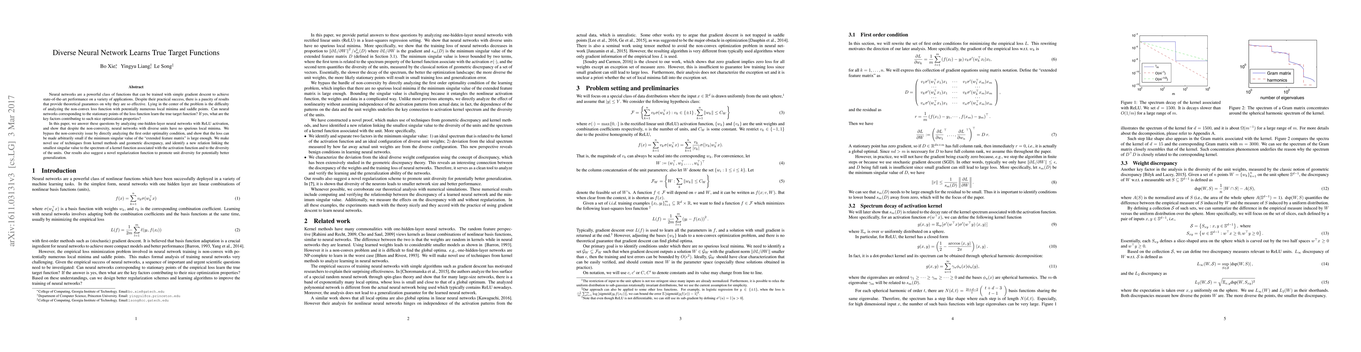 Neural networks are a powerful class of functions that can be trained with simple gradient descent to achieve state-of-the-art performance on a variety of applications. Despite their practical success, there is a paucity of results that provide theoretical guarantees on why they are so effective. Lying in the center of the problem is the difficulty of analyzing the non-convex loss function with potentially numerous local minima and saddle points. Can neural networks corresponding to the stationary points of the loss function learn the true target function? If yes, what are the key factors contributing to such nice optimization properties? In this paper, we answer these questions by analyzing one-hidden-layer neural networks with ReLU activation, and show that despite the non-convexity, neural networks with diverse units have no spurious local minima. We bypass the non-convexity issue by directly analyzing the first order optimality condition, and show that the loss can be made arbitrarily small if the minimum singular value of the "extended feature matrix" is large enough. We make novel use of techniques from kernel methods and geometric discrepancy, and identify a new relation linking the smallest singular value to the spectrum of a kernel function associated with the activation function and to the diversity of the units. Our results also suggest a novel regularization function to promote unit diversity for potentially better generalization.