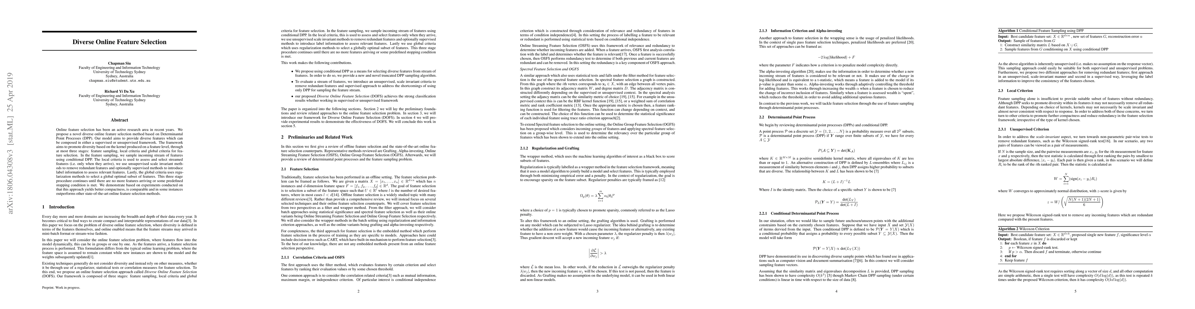 This paper proposes a novel diverse online feature selection method using Determinantal Point Processes (DPP) to select a diverse set of features through three stages: feature sampling, local criteria, and global criteria. The method demonstrates better compactness and comparable performance to other state-of-the-art methods in experiments.