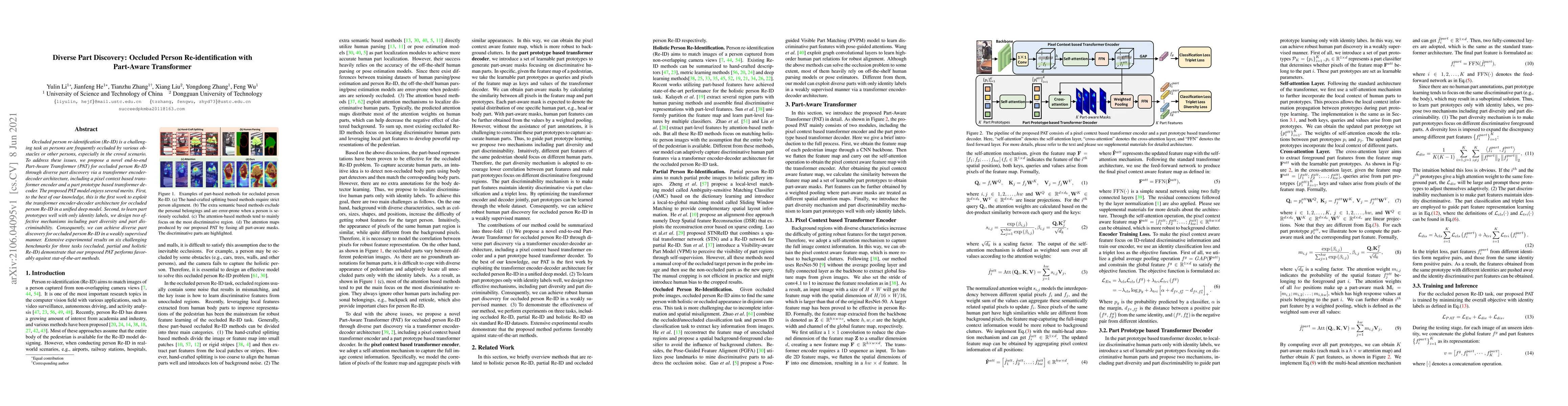 This paper proposes a Part-Aware Transformer (PAT) for occluded person re-identification, utilizing a transformer encoder-decoder architecture to discover diverse body parts. The PAT model includes mechanisms for part diversity and discriminability, achieving state-of-the-art results on six benchmarks for occluded, partial, and holistic re-identification tasks.