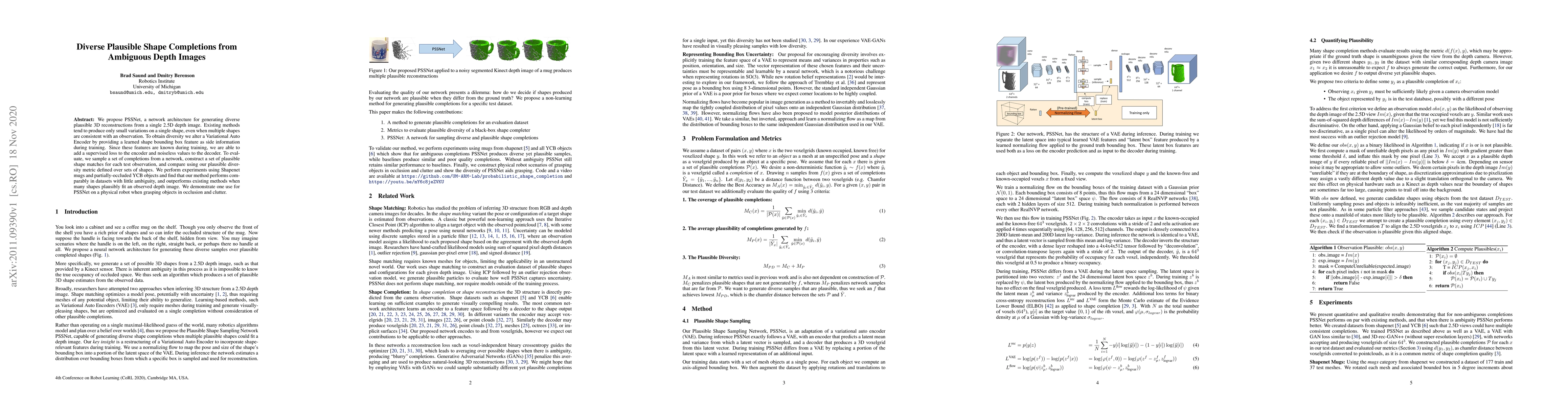 We propose PSSNet, a network architecture for generating diverse plausible 3D reconstructions from a single 2.5D depth image. Existing methods tend to produce only small variations on a single shape, even when multiple shapes are consistent with an observation. To obtain diversity we alter a Variational Auto Encoder by providing a learned shape bounding box feature as side information during training. Since these features are known during training, we are able to add a supervised loss to the encoder and noiseless values to the decoder. To evaluate, we sample a set of completions from a network, construct a set of plausible shape matches for each test observation, and compare using our plausible diversity metric defined over sets of shapes. We perform experiments using Shapenet mugs and partially-occluded YCB objects and find that our method performs comparably in datasets with little ambiguity, and outperforms existing methods when many shapes plausibly fit an observed depth image. We demonstrate one use for PSSNet on a physical robot when grasping objects in occlusion and clutter.