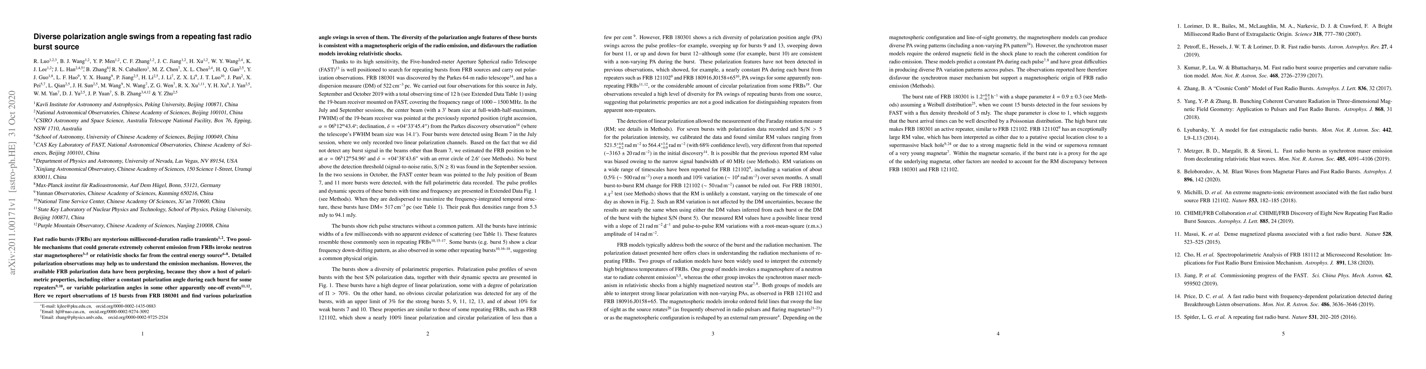 Fast radio bursts (FRBs) are millisecond-duration radio transients of unknown origin. Two possible mechanisms that could generate extremely coherent emission from FRBs invoke neutron star magnetospheres or relativistic shocks far from the central energy source. Detailed polarization observations may help us to understand the emission mechanism. However, the available FRB polarization data have been perplexing, because they show a host of polarimetric properties, including either a constant polarization angle during each burst for some repeaters or variable polarization angles in some other apparently one-off events. Here we report observations of 15 bursts from FRB 180301 and find various polarization angle swings in seven of them. The diversity of the polarization angle features of these bursts is consistent with a magnetospheric origin of the radio emission, and disfavours the radiation models invoking relativistic shocks.