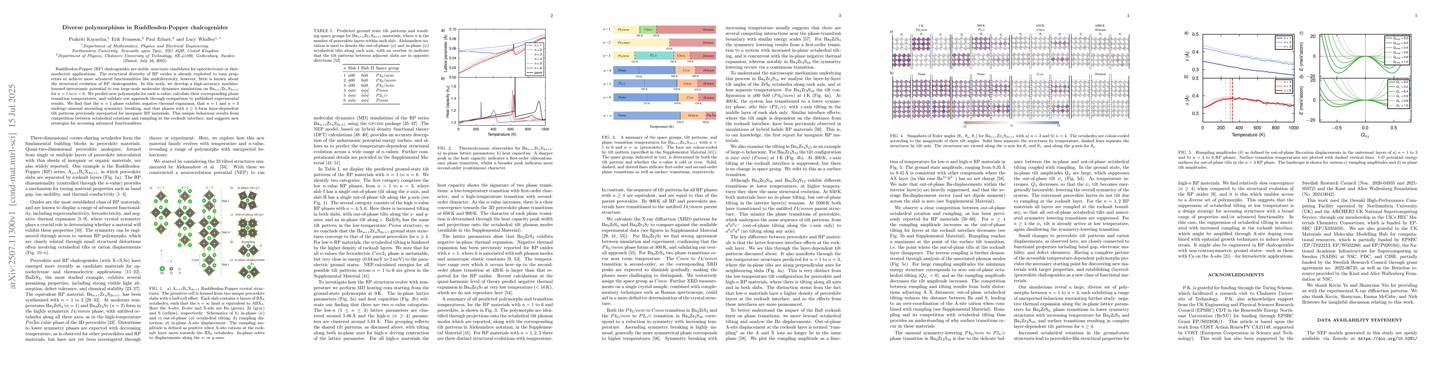 Ruddlesden-Popper (RP) chalcogenides are stable, non-toxic candidates for optoelectronic or thermoelectric applications. The structural diversity of RP oxides is already exploited to tune properties or achieve more advanced functionalities like multiferroicity, however, little is known about the structural evolution of RP chalcogenides. In this work, we develop a high-accuracy machine-learned interatomic potential to run large-scale molecular dynamics simulations on $Ba_{n+1}Zr_nS_{3n+1}$ for $n=1$ to $n=6$. We predict new polymorphs for each $n$-value, calculate their corresponding phase transition temperatures, and validate our approach through comparison to published experimental results. We find that the $n=1$ phase exhibits negative thermal expansion, that $n=1$ and $n=3$ undergo unusual ascending symmetry breaking, and that phases with $n\geq4$ form layer-dependent tilt patterns previously unreported for inorganic RP materials. This unique behaviour results from competition between octahedral rotations and rumpling at the rocksalt interface, and suggests new strategies for accessing advanced functionalities.