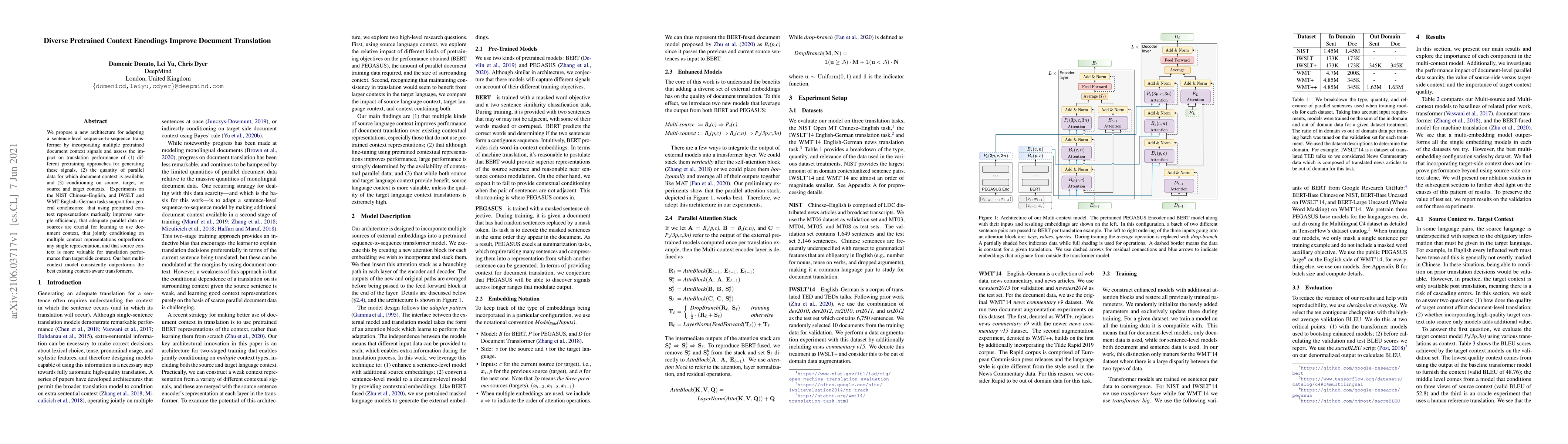 This paper shows that using multiple pretrained document context signals improves translation performance, especially with more parallel data resources, while conditioning on source or both contexts yields better results.