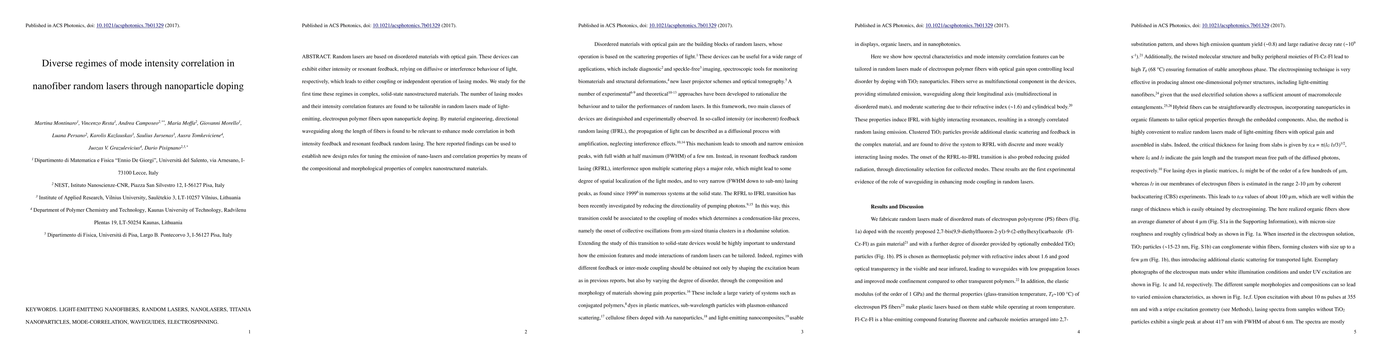 Random lasers are based on disordered materials with optical gain. These devices can exhibit either intensity or resonant feedback, relying on diffusive or interference behaviour of light, respectively, which leads to either coupling or independent operation of lasing modes. We study for the first time these regimes in complex, solid-state nanostructured materials. The number of lasing modes and their intensity correlation features are found to be tailorable in random lasers made of light-emitting, electrospun polymer fibers upon nanoparticle doping. By material engineering, directional waveguiding along the length of fibers is found to be relevant to enhance mode correlation in both intensity feedback and resonant feedback random lasing. The here reported findings can be used to establish new design rules for tuning the emission of nano-lasers and correlation properties by means of the compositional and morphological properties of complex nanostructured materials.
