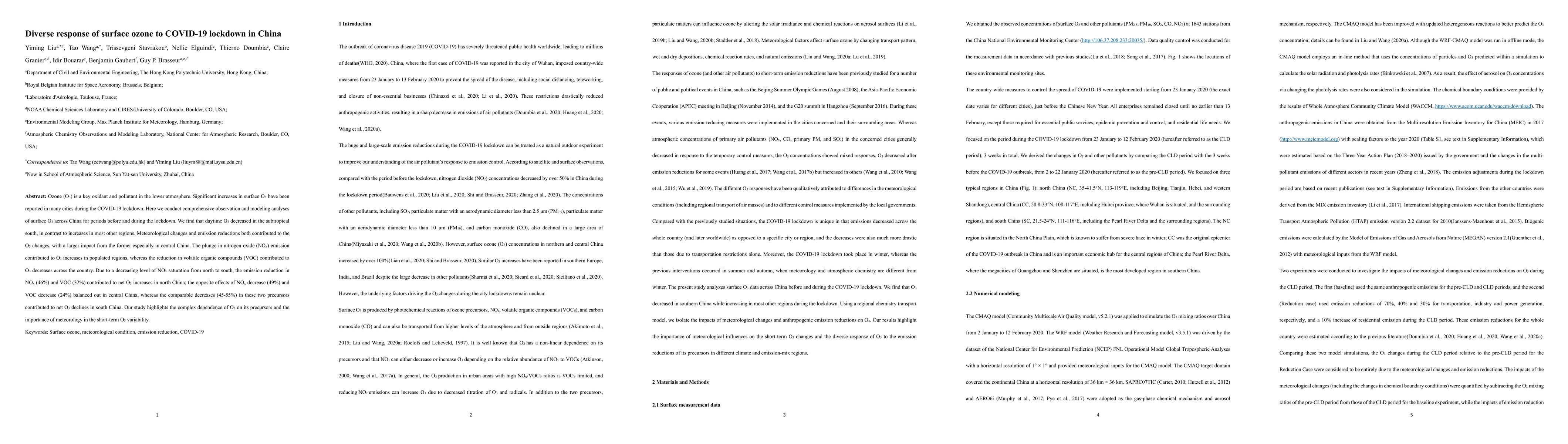 During China's COVID-19 lockdown, surface ozone levels varied across regions, with decreases in southern subtropical areas and increases in northern populated regions due to changes in meteorology and emission reductions of nitrogen oxides and volatile organic compounds.