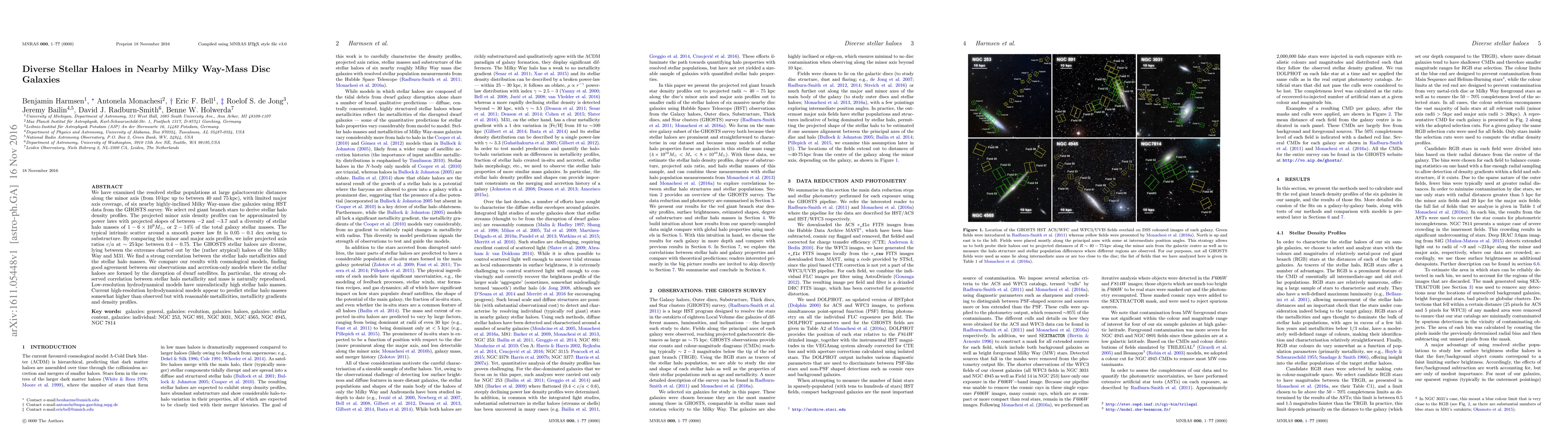 We have examined the resolved stellar populations at large galactocentric distances along the minor axis (from 10 kpc up to between 40 and 75 kpc), with limited major axis coverage, of six nearby highly-inclined Milky Way-mass disc galaxies using HST data from the GHOSTS survey. We select red giant branch stars to derive stellar halo density profiles. The projected minor axis density profiles can be approximated by power laws with projected slopes of between $-2$ and $-3.7$ and a diversity of stellar halo masses of $1-6\times 10^{9}M_{\odot}$, or $2-14\%$ of the total galaxy stellar masses. The typical intrinsic scatter around a smooth power law fit is $0.05-0.1$ dex owing to substructure. By comparing the minor and major axis profiles, we infer projected axis ratios $c/a$ at $\sim 25$ kpc between $0.4-0.75$. The GHOSTS stellar haloes are diverse, lying between the extremes charted out by the (rather atypical) haloes of the Milky Way and M31. We find a strong correlation between the stellar halo metallicities and the stellar halo masses. We compare our results with cosmological models, finding good agreement between our observations and accretion-only models where the stellar haloes are formed by the disruption of dwarf satellites. In particular, the strong observed correlation between stellar halo metallicity and mass is naturally reproduced. Low-resolution hydrodynamical models have unrealistically high stellar halo masses. Current high-resolution hydrodynamical models appear to predict stellar halo masses somewhat higher than observed but with reasonable metallicities, metallicity gradients and density profiles.