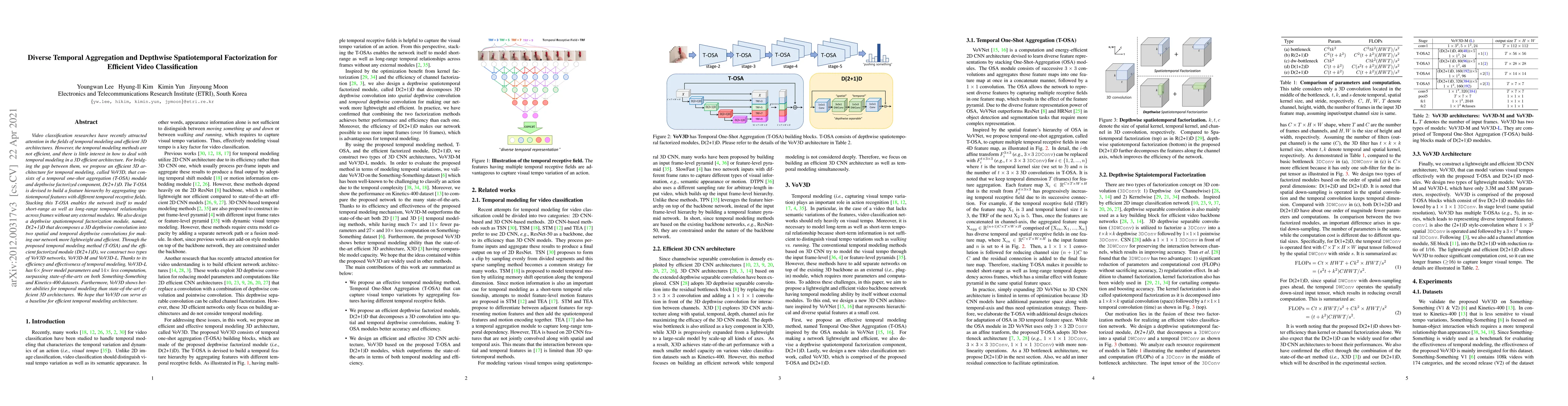 This paper proposes VoV3D, an efficient 3D architecture for video classification that combines temporal one-shot aggregation (T-OSA) and depthwise spatiotemporal factorization (D(2+1)D) to model temporal relationships and reduce computational load. VoV3D-L demonstrates significant efficiency gains with fewer parameters and computations while outperforming existing methods on benchmark datasets.