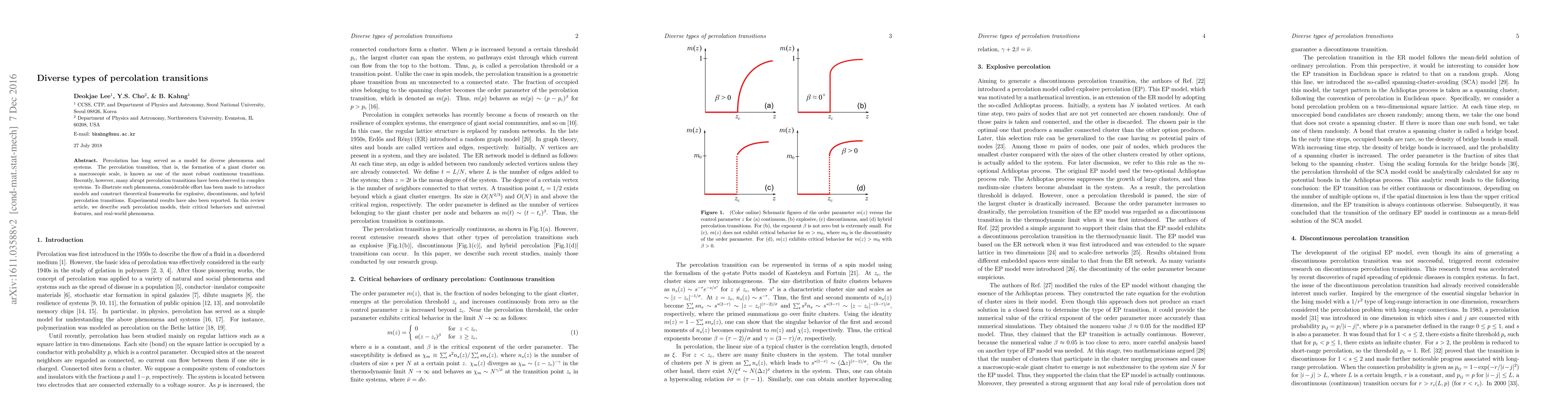 This review explores various types of percolation transitions beyond the traditional continuous model, including explosive, discontinuous, and hybrid transitions. It discusses the critical behaviors and universal features of these models, alongside experimental observations and their applications to real-world phenomena.