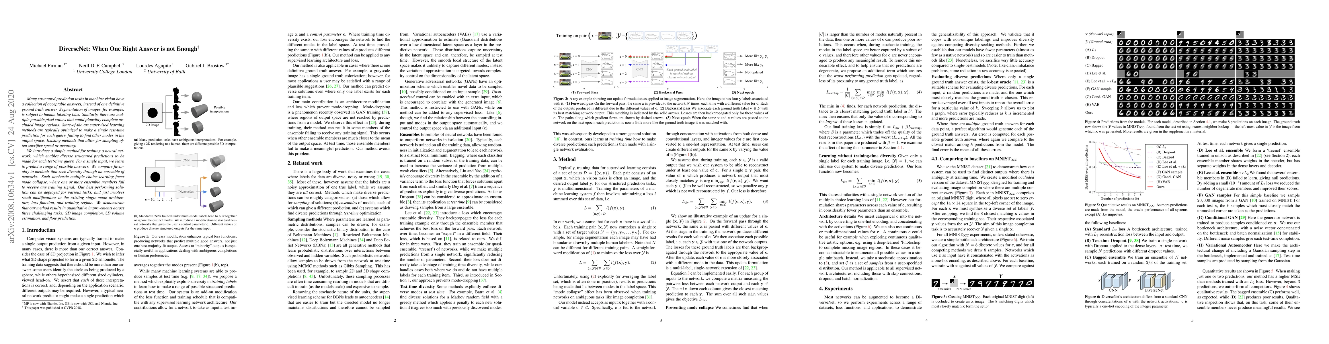 Many structured prediction tasks in machine vision have a collection of acceptable answers, instead of one definitive ground truth answer. Segmentation of images, for example, is subject to human labeling bias. Similarly, there are multiple possible pixel values that could plausibly complete occluded image regions. State-of-the art supervised learning methods are typically optimized to make a single test-time prediction for each query, failing to find other modes in the output space. Existing methods that allow for sampling often sacrifice speed or accuracy. We introduce a simple method for training a neural network, which enables diverse structured predictions to be made for each test-time query. For a single input, we learn to predict a range of possible answers. We compare favorably to methods that seek diversity through an ensemble of networks. Such stochastic multiple choice learning faces mode collapse, where one or more ensemble members fail to receive any training signal. Our best performing solution can be deployed for various tasks, and just involves small modifications to the existing single-mode architecture, loss function, and training regime. We demonstrate that our method results in quantitative improvements across three challenging tasks: 2D image completion, 3D volume estimation, and flow prediction.