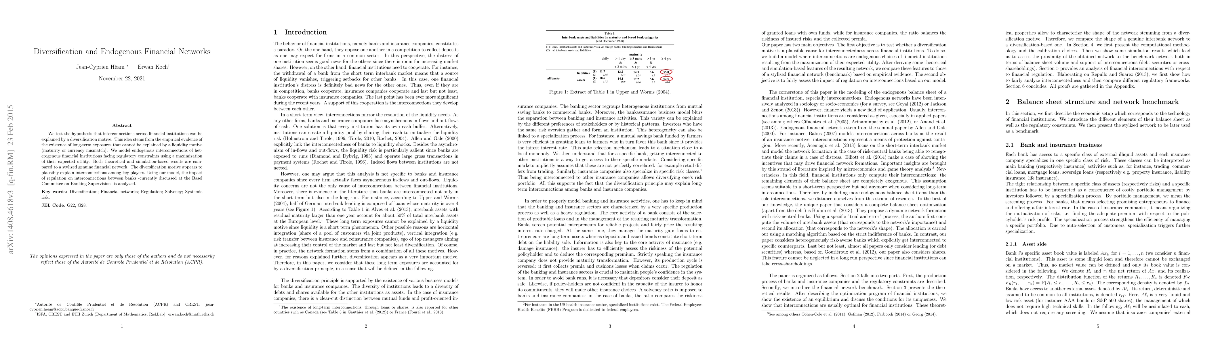 We test the hypothesis that interconnections across financial institutions can be explained by a diversification motive. This idea stems from the empirical evidence of the existence of long-term exposures that cannot be explained by a liquidity motive (maturity or currency mismatch). We model endogenous interconnections of heterogenous financial institutions facing regulatory constraints using a maximization of their expected utility. Both theoretical and simulation-based results are compared to a stylized genuine financial network. The diversification motive appears to plausibly explain interconnections among key players. Using our model, the impact of regulation on interconnections between banks -currently discussed at the Basel Committee on Banking Supervision- is analyzed.