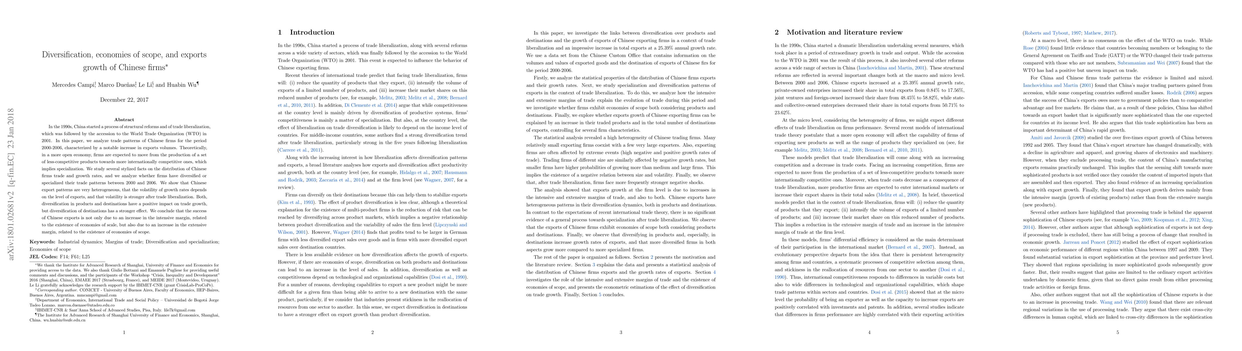 This paper examines the trade patterns of Chinese firms from 2000 to 2006, highlighting the significant increase in export volumes following trade liberalization. The study finds that diversification in both products and destinations positively impacts trade growth, with diversification in destinations having a stronger effect, indicating the importance of economies of scope.