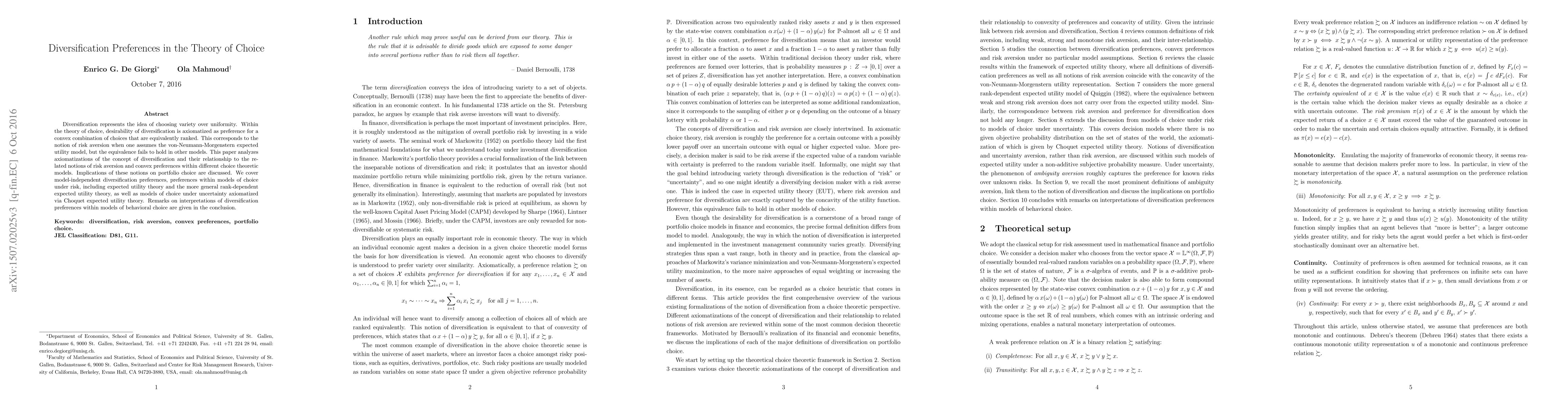 Diversification represents the idea of choosing variety over uniformity. Within the theory of choice, desirability of diversification is axiomatized as preference for a convex combination of choices that are equivalently ranked. This corresponds to the notion of risk aversion when one assumes the von-Neumann-Morgenstern expected utility model, but the equivalence fails to hold in other models. This paper studies axiomatizations of the concept of diversification and their relationship to the related notions of risk aversion and convex preferences within different choice theoretic models. Implications of these notions on portfolio choice are discussed. We cover model-independent diversification preferences, preferences within models of choice under risk, including expected utility theory and the more general rank-dependent expected utility theory, as well as models of choice under uncertainty axiomatized via Choquet expected utility theory. Remarks on interpretations of diversification preferences within models of behavioral choice are given in the conclusion.