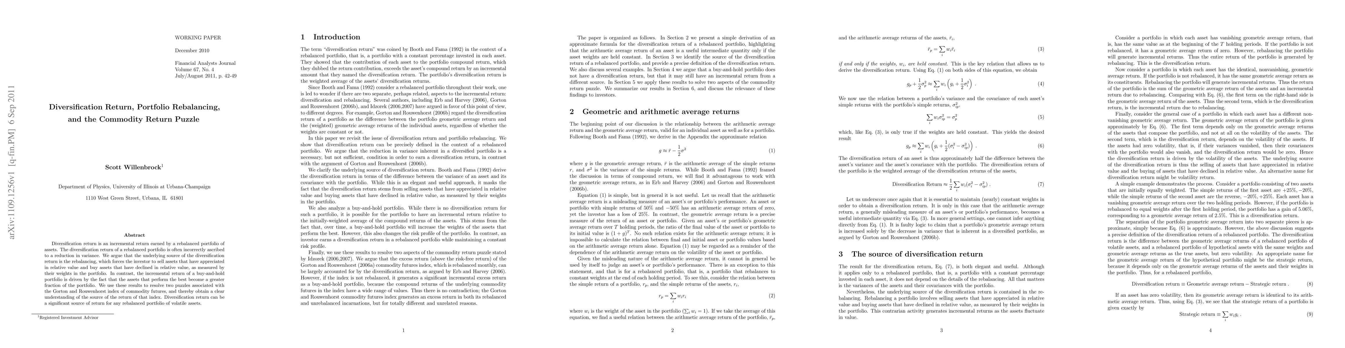 This paper argues that diversification return in rebalanced portfolios arises from rebalancing rather than variance reduction, as rebalancing forces investors to sell appreciated assets and buy depreciated ones. It resolves puzzles related to the Gorton and Rouwenhorst commodity futures index, clarifying that rebalancing, not reduced variance, is the primary source of return.