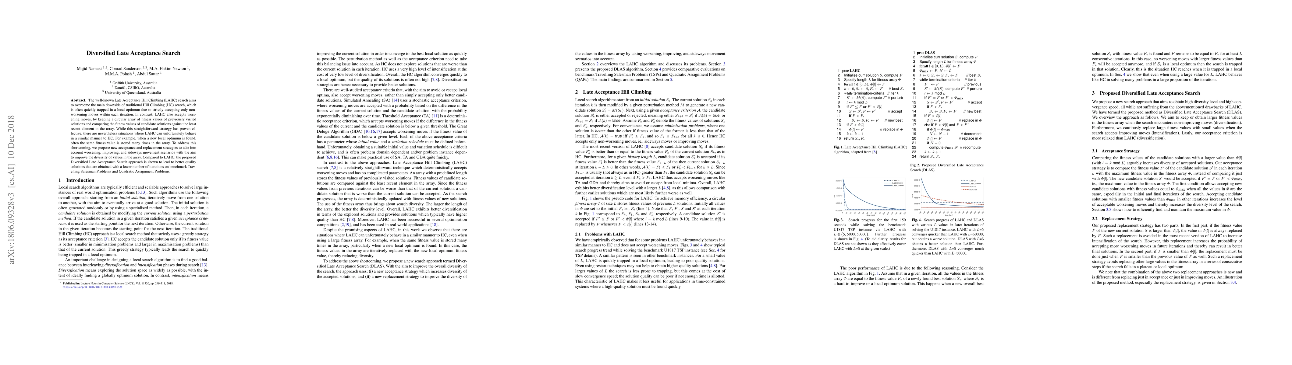The well-known Late Acceptance Hill Climbing (LAHC) search aims to overcome the main downside of traditional Hill Climbing (HC) search, which is often quickly trapped in a local optimum due to strictly accepting only non-worsening moves within each iteration. In contrast, LAHC also accepts worsening moves, by keeping a circular array of fitness values of previously visited solutions and comparing the fitness values of candidate solutions against the least recent element in the array. While this straightforward strategy has proven effective, there are nevertheless situations where LAHC can unfortunately behave in a similar manner to HC. For example, when a new local optimum is found, often the same fitness value is stored many times in the array. To address this shortcoming, we propose new acceptance and replacement strategies to take into account worsening, improving, and sideways movement scenarios with the aim to improve the diversity of values in the array. Compared to LAHC, the proposed Diversified Late Acceptance Search approach is shown to lead to better quality solutions that are obtained with a lower number of iterations on benchmark Travelling Salesman Problems and Quadratic Assignment Problems.