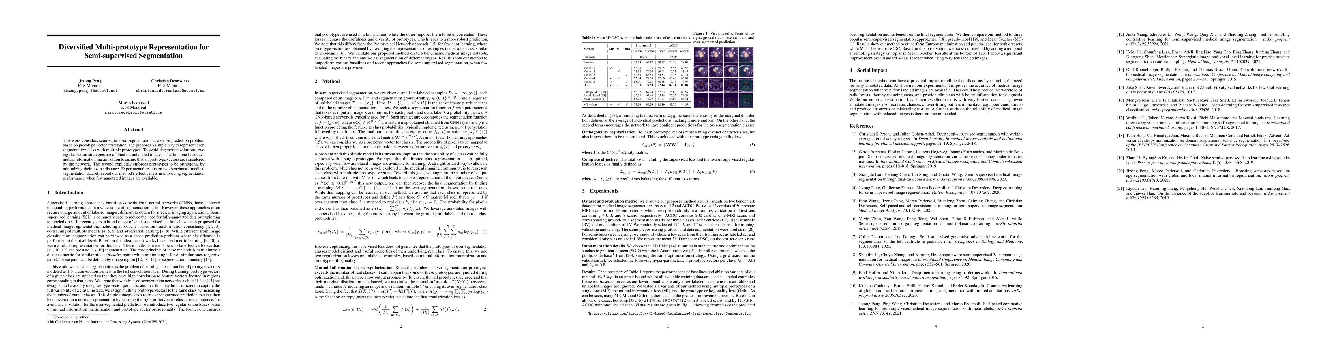 This work considers semi-supervised segmentation as a dense prediction problem based on prototype vector correlation and proposes a simple way to represent each segmentation class with multiple prototypes. To avoid degenerate solutions, two regularization strategies are applied on unlabeled images. The first one leverages mutual information maximization to ensure that all prototype vectors are considered by the network. The second explicitly enforces prototypes to be orthogonal by minimizing their cosine distance. Experimental results on two benchmark medical segmentation datasets reveal our method's effectiveness in improving segmentation performance when few annotated images are available.
