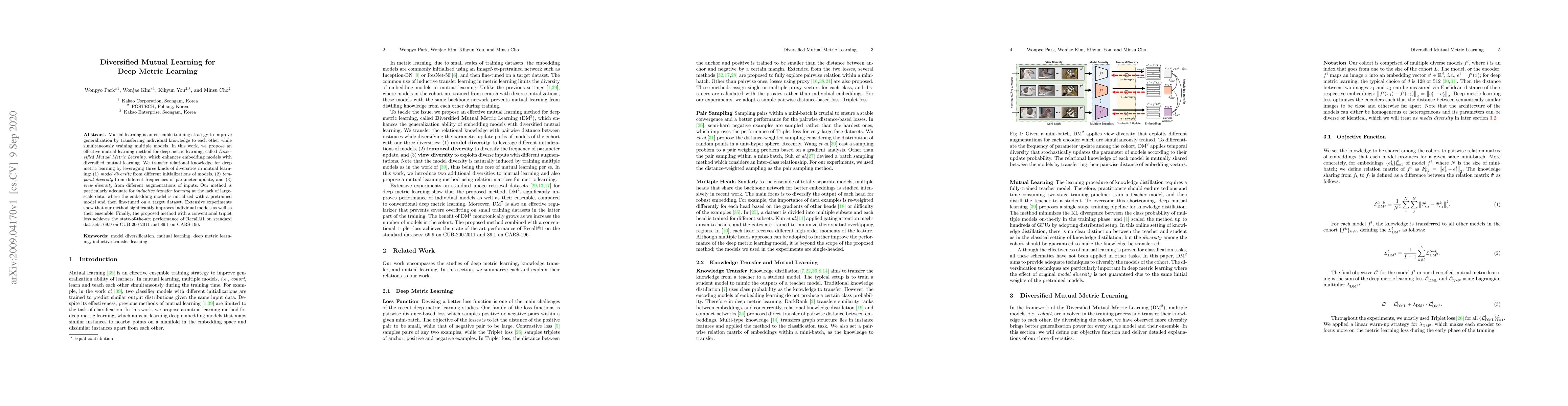 This paper proposes Diversified Mutual Metric Learning to enhance deep metric learning through an ensemble training strategy that leverages model, temporal, and view diversities. The method shows significant improvements in both individual and ensemble model performance, achieving state-of-the-art Recall@1 results on CUB-200-2011 and CARS-196 datasets.