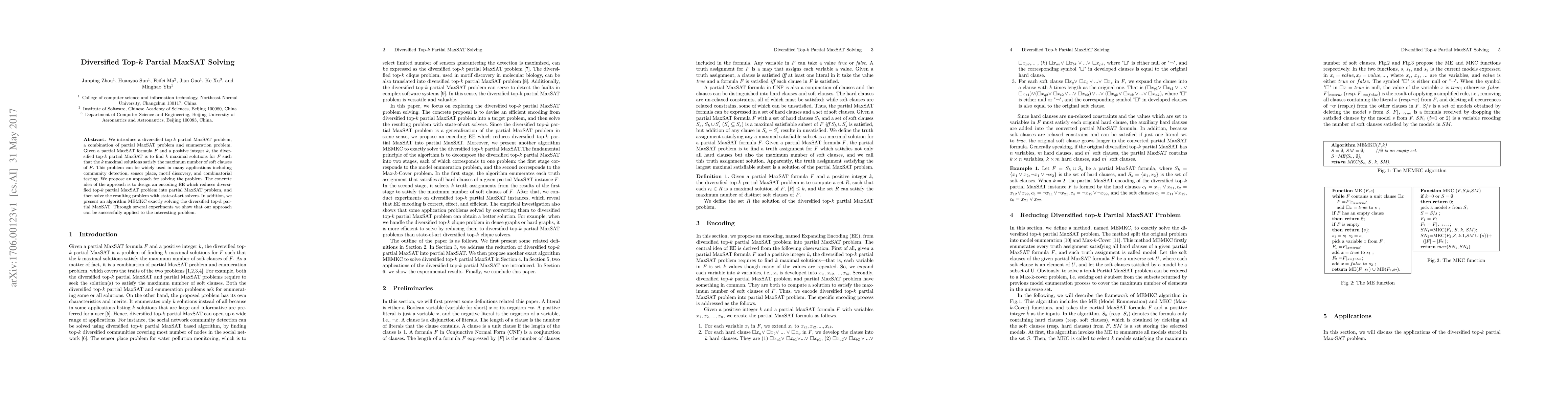 We introduce a diversified top-k partial MaxSAT problem, a combination of partial MaxSAT problem and enumeration problem. Given a partial MaxSAT formula F and a positive integer k, the diversified top-k partial MaxSAT is to find k maximal solutions for F such that the k maximal solutions satisfy the maximum number of soft clauses of F. This problem can be widely used in many applications including community detection, sensor place, motif discovery, and combinatorial testing. We prove the problem is NP-hard and propose an approach for solving the problem. The concrete idea of the approach is to design an encoding EE which reduces diversified top-k partial MaxSAT problem into partial MaxSAT problem, and then solve the resulting problem with state-of-art solvers. In addition, we present an algorithm MEMKC exactly solving the diversified top-k partial MaxSAT. Through several experiments we show that our approach can be successfully applied to the interesting problem.