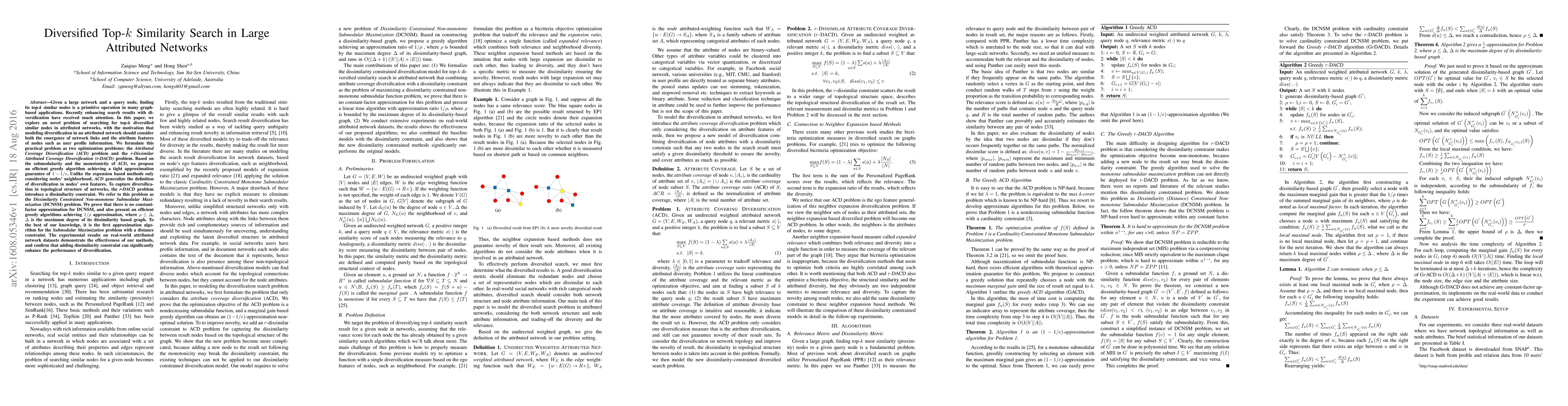 This paper explores top-k diversified similarity search in large attributed networks, formulating the problem as Attributed Coverage Diversification (ACD) and r-Dissimilar Attributed Coverage Diversification (r-DACD). It proposes efficient greedy algorithms with approximation guarantees for both problems, demonstrating their effectiveness through experiments on real-world datasets.