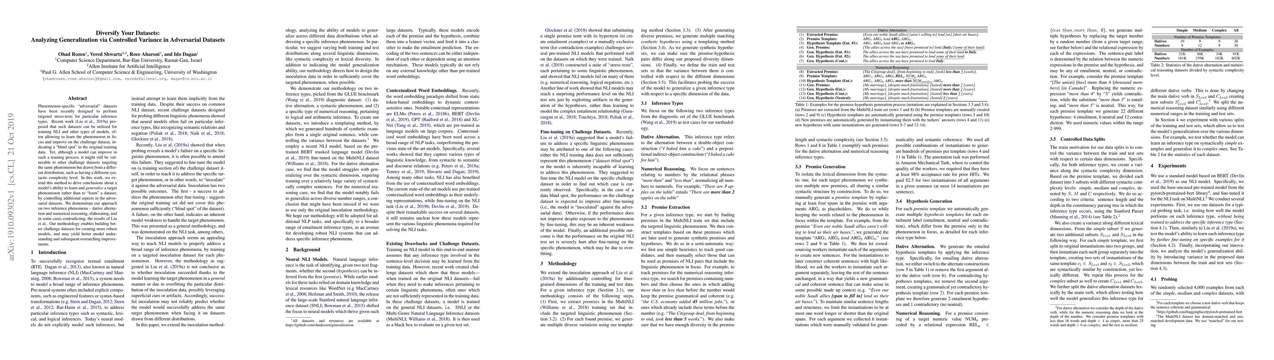 This paper explores the use of controlled variance in adversarial datasets to test and improve model generalization for specific inference phenomena. By extending previous methods, the authors demonstrate how varying aspects in these datasets can reveal a model's true learning capabilities and vulnerabilities, ultimately aiming to create more robust and better-understood models.