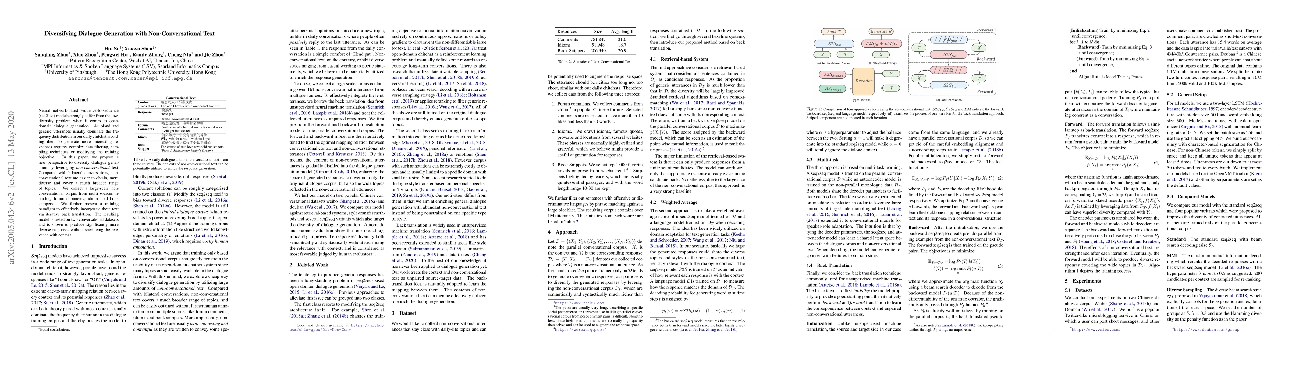 This research proposes using non-conversational text to diversify dialogue generation in seq2seq models, which often produce bland responses. They collect a large, diverse non-conversational corpus and introduce a training method involving iterative back translation, resulting in more varied yet contextually relevant responses in tests on conversational datasets.