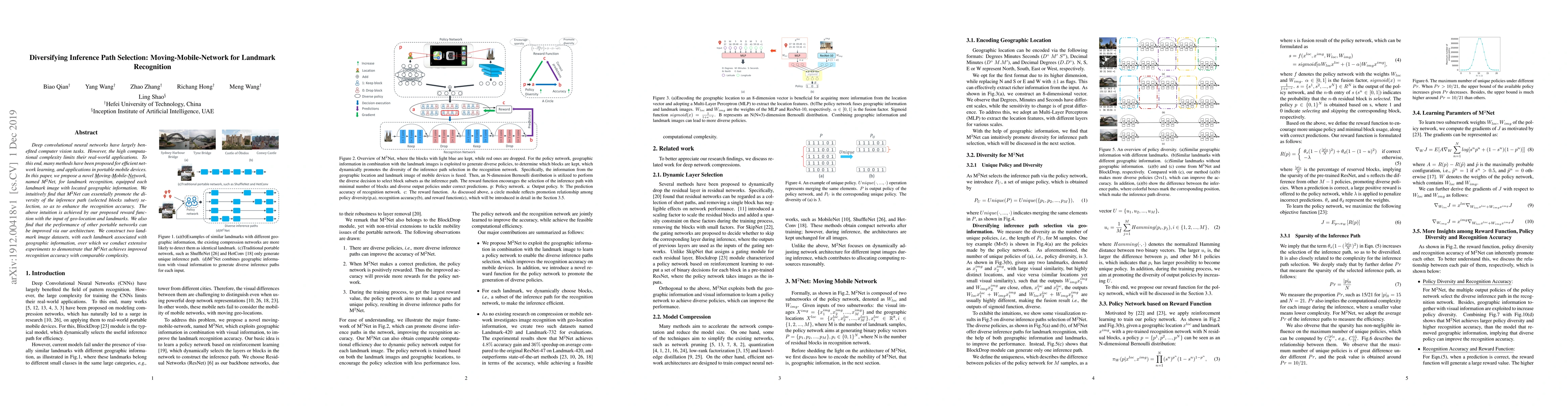 Deep convolutional neural networks have largely benefited computer vision tasks. However, the high computational complexity limits their real-world applications. To this end, many methods have been proposed for efficient network learning, and applications in portable mobile devices. In this paper, we propose a novel \underline{M}oving-\underline{M}obile-\underline{Net}work, named M$^2$Net, for landmark recognition, equipped each landmark image with located geographic information. We intuitively find that M$^2$Net can essentially promote the diversity of the inference path (selected blocks subset) selection, so as to enhance the recognition accuracy. The above intuition is achieved by our proposed reward function with the input of geo-location and landmarks. We also find that the performance of other portable networks can be improved via our architecture. We construct two landmark image datasets, with each landmark associated with geographic information, over which we conduct extensive experiments to demonstrate that M$^2$Net achieves improved recognition accuracy with comparable complexity.